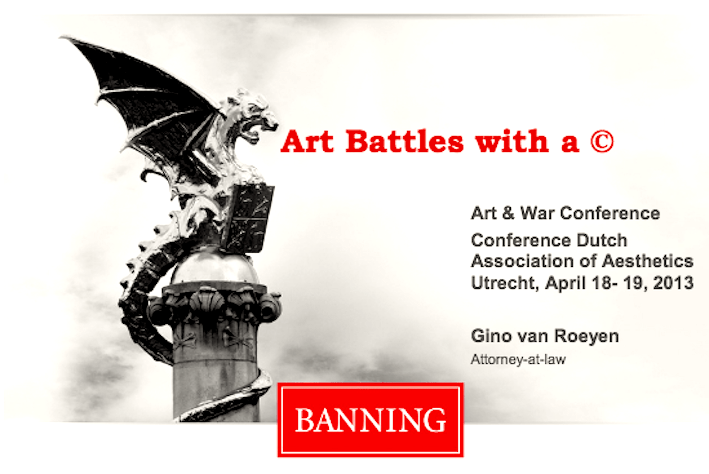 1 Art Battles with a Art & War Conference Conference Dutch Association of Aesthetics Utrecht, April 18-19, 2013 Attorney-at-law some background self-portrait 1988 We always thought of history as a linear line, a development from A to B and then to Z, and now somebody said we start the alphabet with C, we start the alphabet with copyright, we just take an image and nothing new (Rob Scholte, Pirate Conference,Tilburg, September 17, 2010)