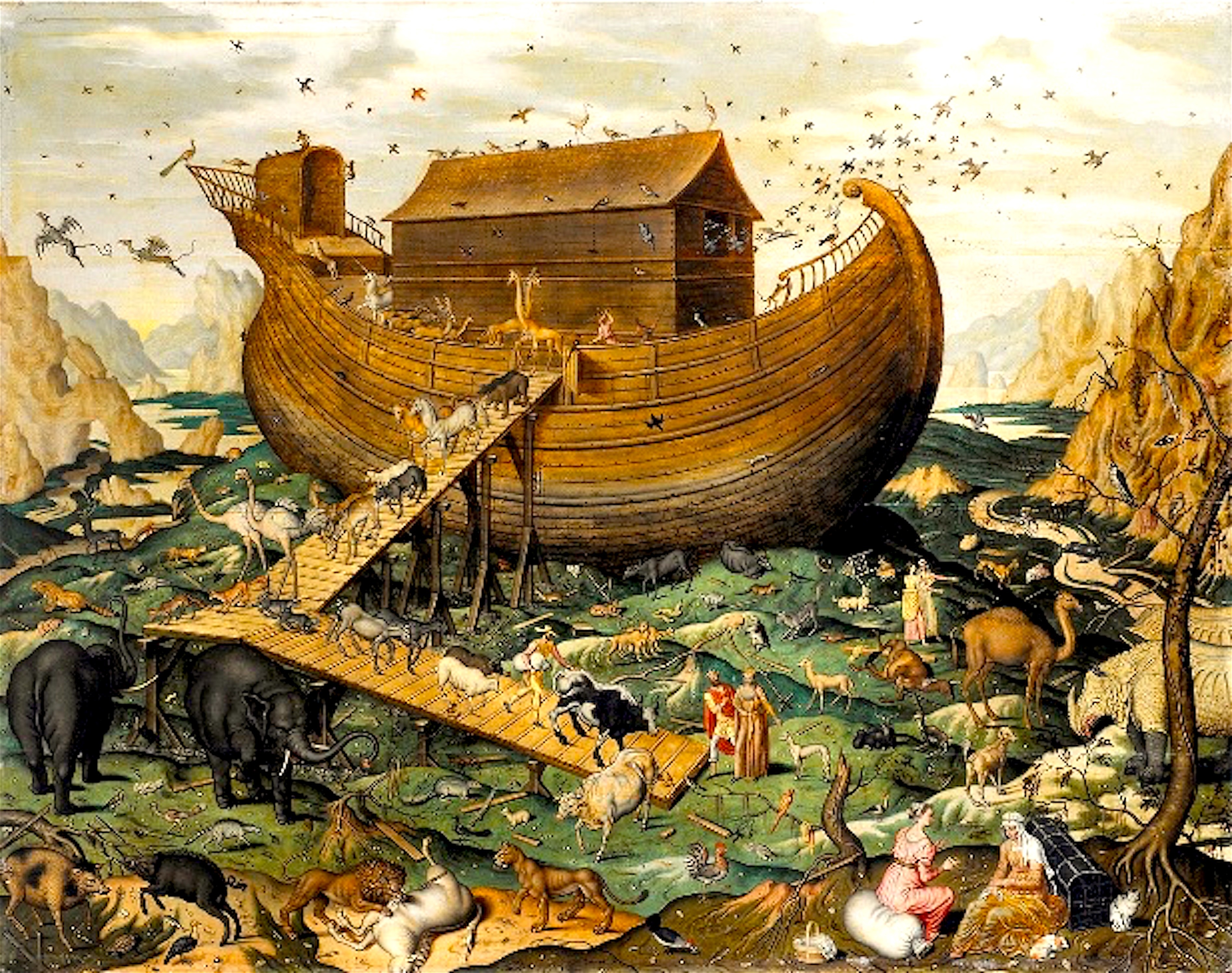 Old depiction of the animals and birds leaving the Ark, but where are the dinosaurs?