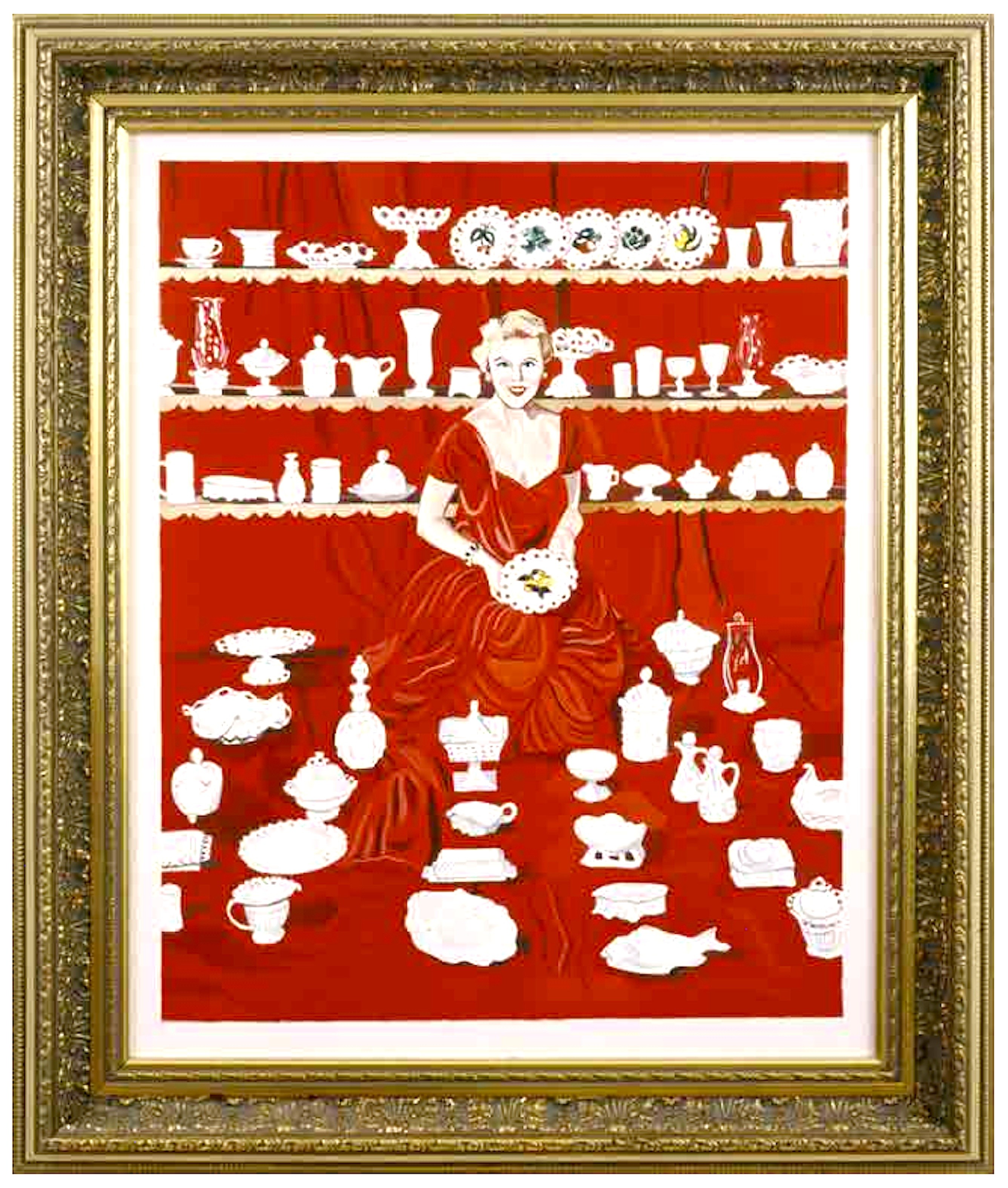 ‘Ik werd verliefd op die plaatjes’ legt Marliz uit. ‘Ik genoot van de weerstand die de plaatje teweeg brachten, de spot en ironie met het schilderen een nieuwe liefdevolle laag te geven.’ Ze plaatste de olieverf schilderijen in gouden lijsten om het banale nog eens extra aan te zetten. De ‘Rijksaankopen’ verwierf een groot werk waar drie stroken behang letterlijk waren nageschilderd in zalmroze met pasteuze strepen. Een fijn portretje van Queen Astrid. Koning Hoessein met zijn zoontje. Plaatjes, allemaal plaatjes die ze machinaal als een scanner schilderde, maar wel vol concentratie en liefde. De NRC recensie over haar allereerste tentoonstelling was vernietigend. Als jongste docent in Kampen durfde ze de klas amper in de ogen te kijken. Ze was absoluut niet klaar voor de lawine aan reacties. Ze vertelt me bijvoorbeeld dat ze speels omging met pornografische afbeeldingen maar de pornobladen niet durfde te kopen. Niet lang daarna hield ze op met lesgeven en tegelijkertijd kreeg ze ook iets vastbijterigs, iets onverzettelijks. Jullie willen dit niet, oké, maar ik ga toch door. Als jullie, de kunstwereld, me een dreun geven, nou ok, dan ga ik extra door, het maakt me niet meer uit. Ze wilde het op een niet-militante manier opnemen voor vrouwen, ze vond dat ze dat moest doen: stelling nemen in een vrouwonvriendelijke wereld. De catalogus die Marliz Frencken in 1993 publiceerde baseerde ze op een goedkope Russische kunstcatalogus uit de tweedehands boekwinkel De Slegte. Het is een vreemd ding, niet sophisticated, terwijl de afgebeelde werken dat wel zijn. Het boek met de rode kaft oogt eerder ordi, als een Wehkampcatalogus. Marliz Frencken, oils staat er uitdagend op de cover.