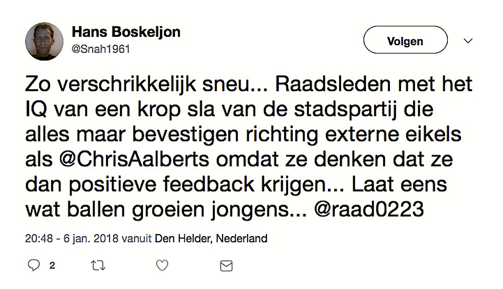 Oeps, @ChrisAalberts denkt dat eigen meningen niet mogen… 😂 — Hans Boskeljon (@Snah1961) 6 januari 2018