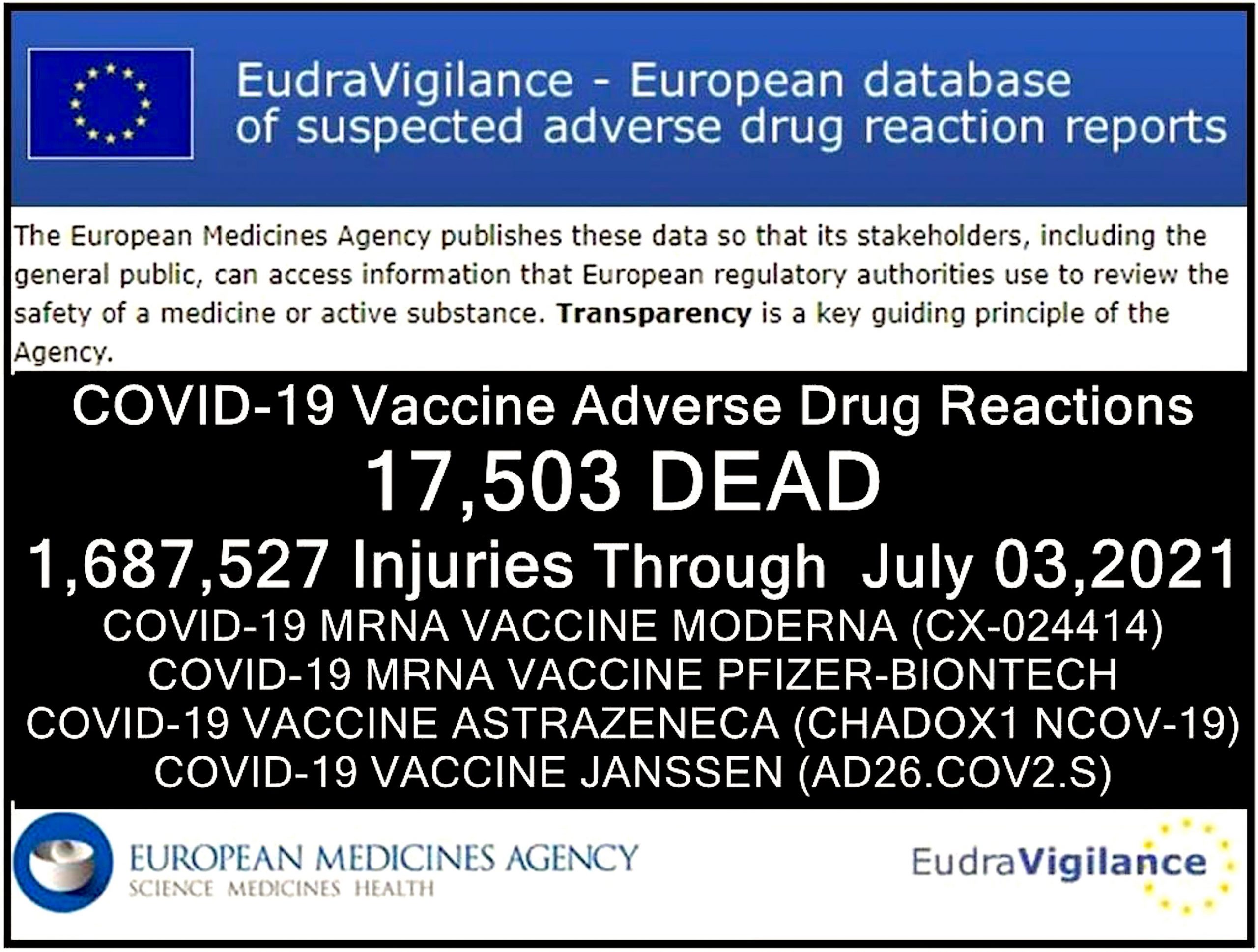 The EudraVigilance Database reports that through July 3, 2021 there are 17,503 Deaths and 1,687,527 injuries reported following Injections of four Experimental COVID 19 Shots.