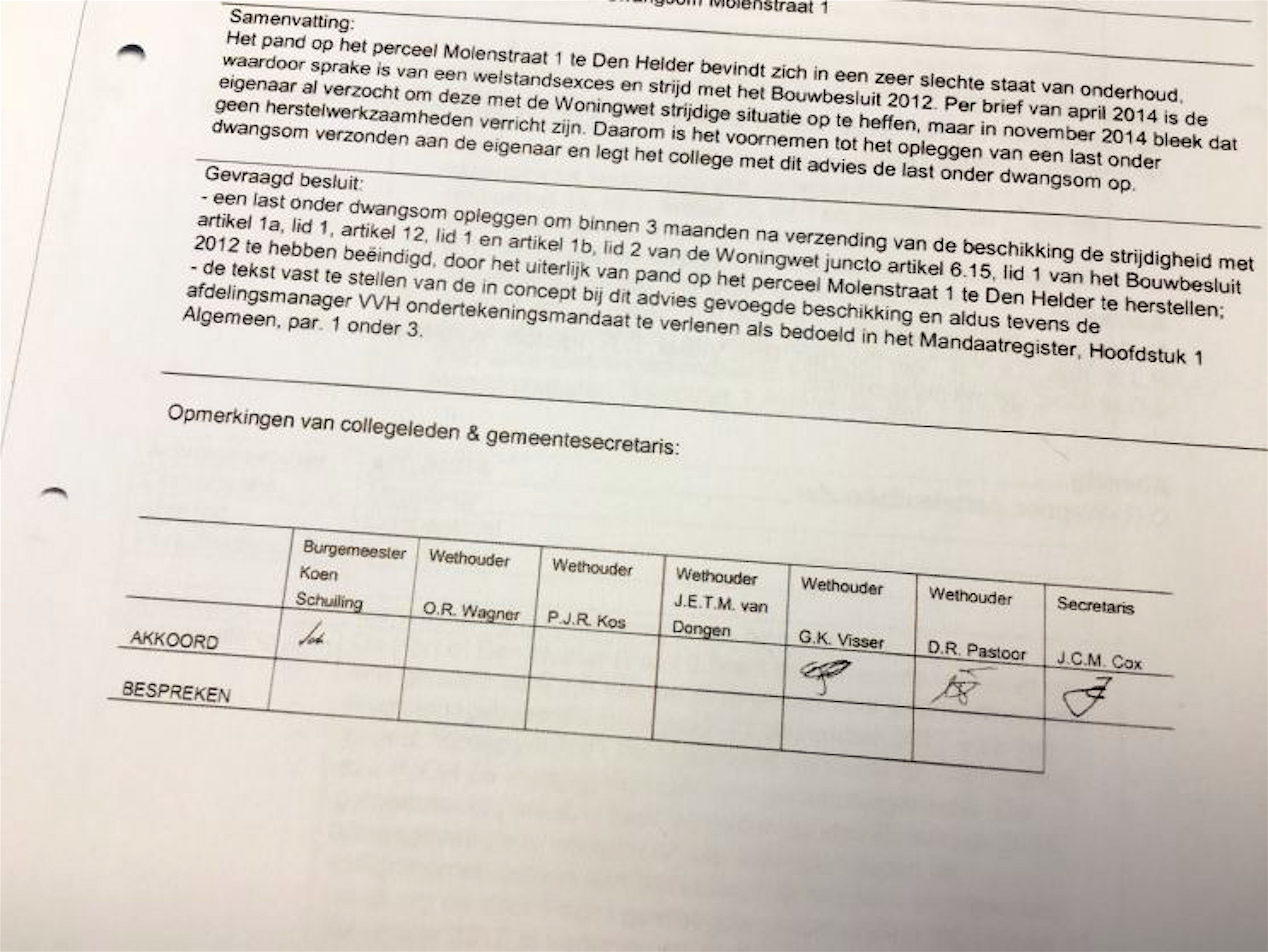 Interessant is in dat verband van wie er parafen onder het stuk staan: die van Schuiling, Visser, Dirk Pastoor (die ook bestrijdt deze zelf te hebben gezet) en van toenmalig gemeentesecretaris Joost Cox, die geen stemrecht heeft in het college.
