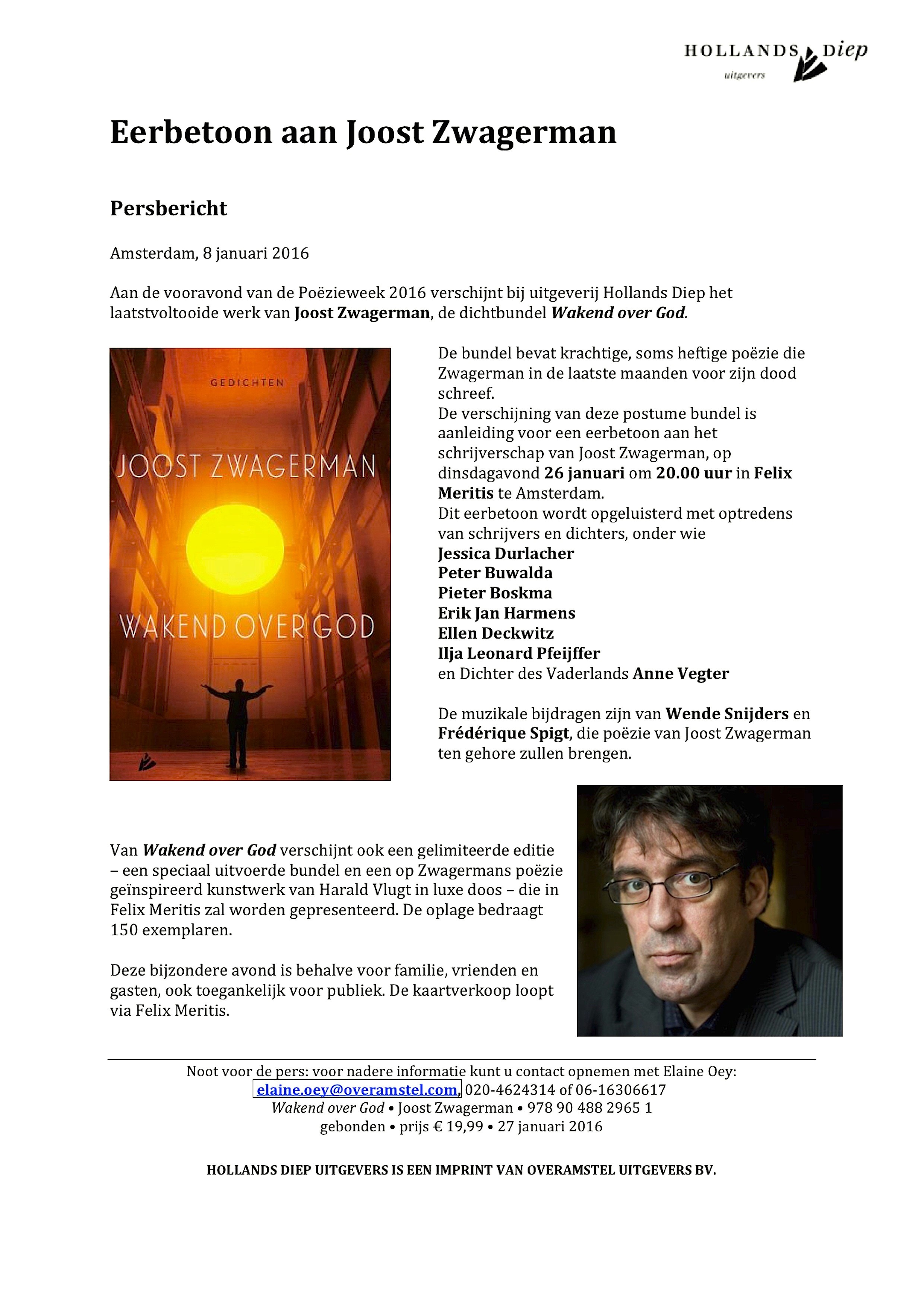 Hollands Diep – Persbericht: Eerbetoon aan Joost Zwagerman 21 januari 2016Gimmick, Home, Locatie, Media, Portretten0 Dit delen: Klik om te delen op Facebook (Opent in een nieuw venster) Facebook Klik om te delen op X (Opent in een nieuw venster) X