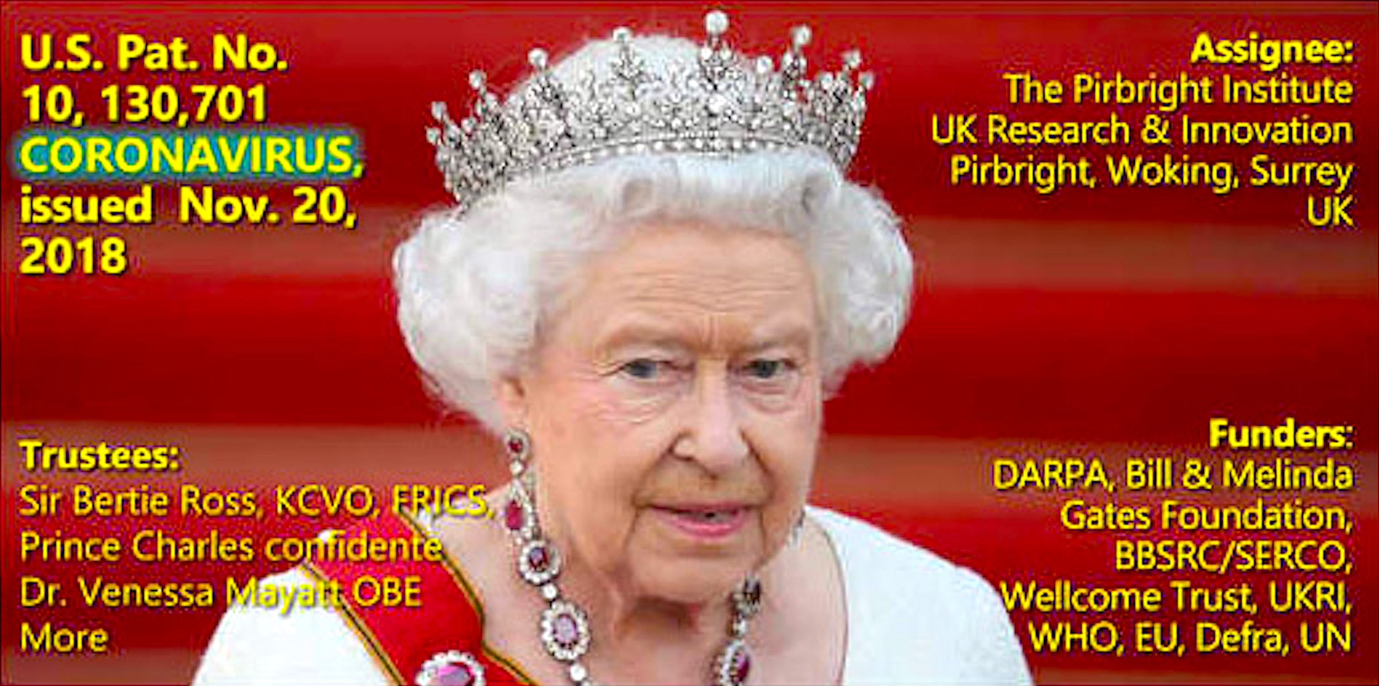 The Queen’s company The Pirbright Institute holds US Patent No. 10,130,701 on CORONA VIRUS. Pirbright tracks back to SERCO Group Plc and QinetiQ Group Plc, which both have contracts with the US Patent Office. Outrageously, SERCO essentially runs the US Patent Office (under the Commerce Department) patent application process! This “inequitable conduct” in patent legal terms is fraud and invalidates the claim while the World fights this British – American Pilgrims Society inspired emerging pandemic, in our opinion. See THE PIRBRIGHT INSTITUTE, Co. No. 00559784. (Jan. 07, 1956). Certificate of Incorporation (https://www.fbcoverup.com/docs/library/1956-01-07-THE-PIRBRIGHT-INSTITUTE-Co-No-00559784–Certificate–of–Incorporation-and-related-records-Companies–House-Jan-07-1956.pdf) and related records Companies House (UK).