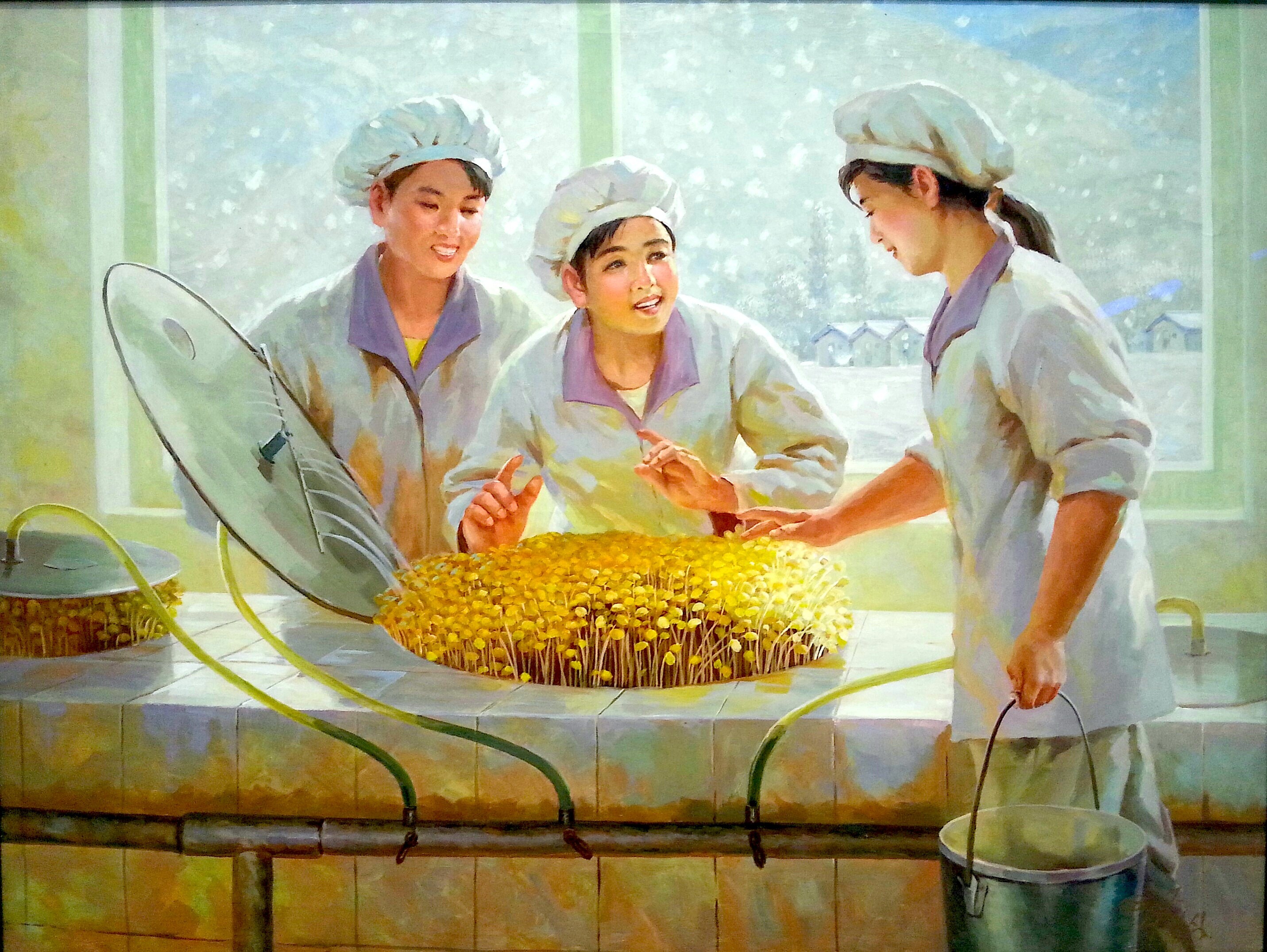 Bont, sneeuw, ijzel, gouden zonsondergangen, ze konden het allemaal en echt prachtig. Je vraagt je af wie de onderwerpen bedacht…. Arbeidsters op een struisvogelfarm. Met beschermende kapjes op in een groentekweek-laboratorium. Met sojamelk-karretje en grote melkcontainer voor een lagere school, enzovoort. De gruwelijke schilderingen van folteringen, exact geschilderd als de foto’s van oorlogscorrespondenten, heb ik links laten liggen, not my cup of tea.