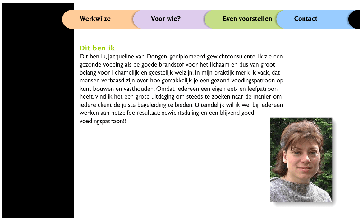 Dit ben ik, Jacqueline van Dongen, gediplomeerd gewichtsconsulente. Ik zie gezonde voeding als de goede brandstof voor het lichaam en dus van groot belang voor lichamelijk en geestelijk welzijn. In mijn praktijk merk ik vaak, dat mensen verbaasd zijn over hoe gemakkelijk je een gezond voedingspatroon op kunt bouwen en vasthouden. Omdat iedereen een eigen eet- en leefpatroon heeft, vind ik het een grote uitdaging om steeds te zoeken naar de manier om iedere cliënt de juiste begeleiding te bieden. Uiteindelijk wil ik wel bij iedereen werken aan hetzelfde resultaat: gewichtsdaling en een blijvend goed voedingspatroon.
