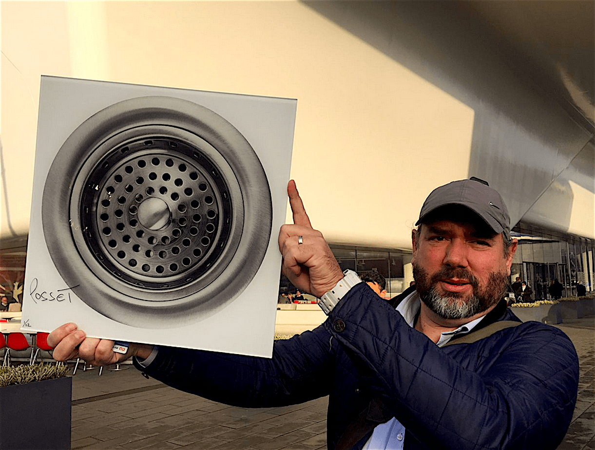 Posset klimt op het bankje en installeert zijn afvoerputje – nummer 1 van een editie van 12, de overige zijn te koop op zijn website – aan de overhangende onderkant van de badkuip.
