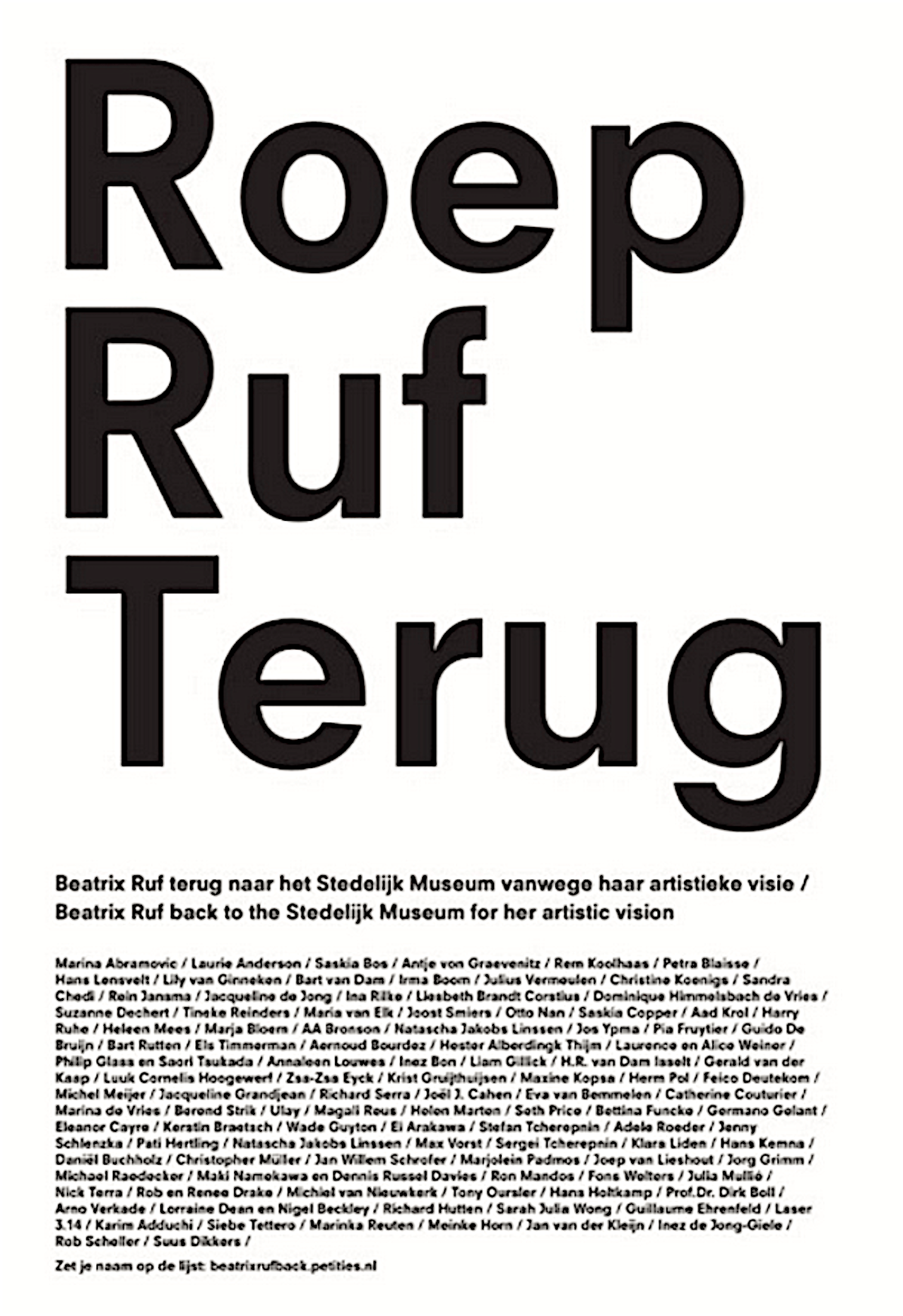 De oproep is ondertekend door Nederlandse en internationale kunstenaars, museummedewerkers, galeriehouders, kunsthistorici, curatoren, architecten en belangrijke private sponsors