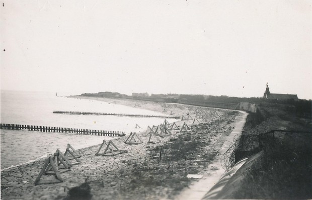 Ook over de dijk is de verslaggever van de Helderse krant kort. ’De kruin van de dijk wordt geheel in beslag genomen door de muur, die weer rijkelijk voorzien is van prikkeldraad. Aan de voet van de dijk zijn betonnen ruiters opgesteld tegen een eventuele landing’. Op de dijk waren behalve talloze bunkers inderdaad op vier plaatsen over een totale lengte van zo’n 1.730 meter anti tank muren geplaatst. Dijkweg en dijkhelling lagen bezaaid met prikkeldraad en merkwaardige betonnen staketsels ’Tetraëder’ genaamd. Bovenop Kijkduin had men een zware betonnen kap aangebracht, waar de beneden bouw niet op berekend bleek.
