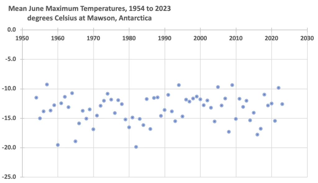 Temperatures down there oscillate within a relatively narrow band, showing no statistically significant long-term warming trend. This is the case whether considering the actual historical measurements, or the temperatures subsequently adjusted by the Bureau before incorporation into other databases. It is also the case if we just consider the June maximum temperature since records began until last month, at Mawson.