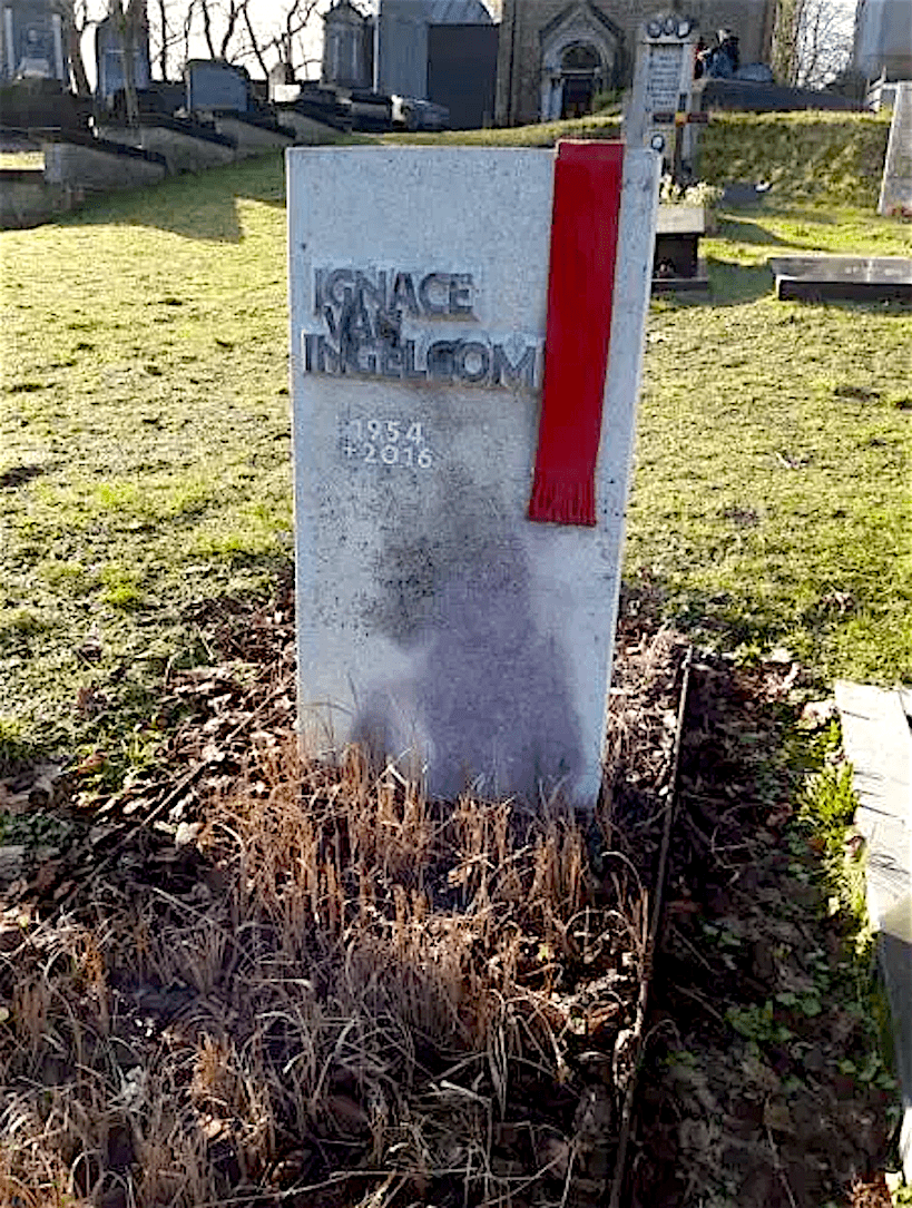 Tot mijn Ontzetting Ontdek ik het Graf van Ignace Van Ingelgom, Al Gestorven in 2016, Nooit Geweten, dat deze Kunstenaar Er Niet Meer was. Kort Stondige Roem heeft hij Gekend met de Canvas Collectie. Ooit heb ik Nog met het Idee Gespeeld hem een Druksel Uitgave aan te Bieden, zijn Werk Kritisch tegen over de Consumptie-én de Kunst Wereld, de Slogans, die Niets Zeggend Zijn. Zijn Werk was Veel Intelligenter, Grappiger en Dieper dan Dat van Jenny Holzer, die Alleen Maar aan de Opper Vlakte Blijft. Van Ingelgom Bracht Woorden bij Elkaar, hij Publiceerde, die Trouw in De Witte Raaf, Net Als Of het Reclames Betrof, bij Voor beeld ‘Nick Nolte, Revolte, Rob Scholte’, die een Klank Over Één Komst hadden, naar Betekenis Niet bij Elkaar Hoorden, hij Stak Ritme in de Rij Woorden, waar door hij aan het Beeldende een Literaire, Retorische Connotatie gaf. Door de Woorden bij Elkaar te Halen, gaf hij Uiter Aard Toch een Nieuwe Betekenis aan de Woorden en die was Kritisch, Soms Zelfs Vernietigend. Holheid! Hij gebruikte Zwart en Rood, Zo droeg hij Al Tijd een Rode Sjaal, Jammerlijk heeft Men dat Element in zijn Graf Zerk Op Genomen, de Anekdote wordt Zo Sentimentele Kitsch. Ter Zijner Ere Prevelde ik