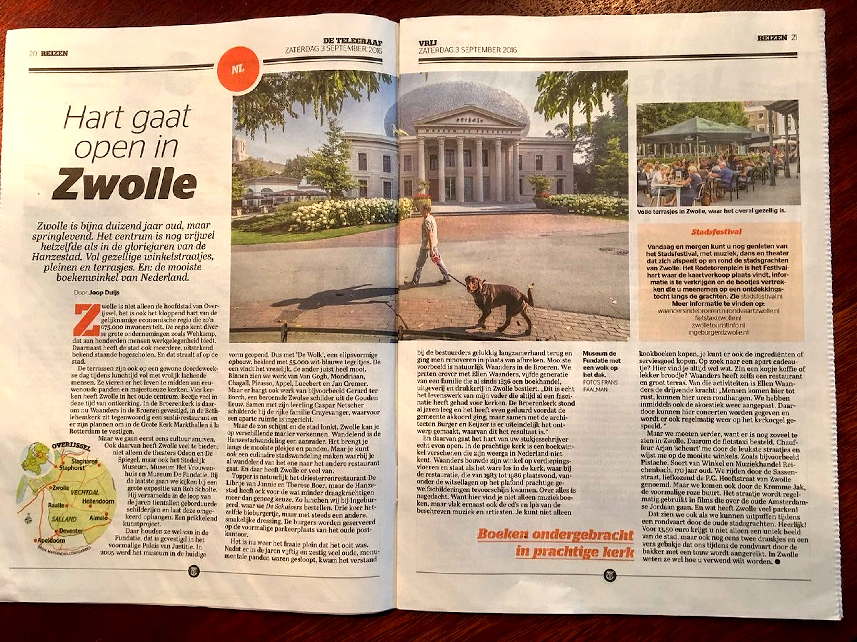 Het is nu weer het fraaie plein dat het ooit was. Nadat er in de jaren vijftig en zestig veel oude, monumentale panden waren gesloopt, kwam het verstandbij de bestuurders gelukkig langzamerhand terug en ging men renoveren in plaats van afbreken. Mooiste voorbeeld is natuurlijk Waanders in de Broeren. We praten erover met Ellen Waanders, vijfde generatie van een familie die al sinds 1836 een boekhandel, uitgeverij en drukkerij in Zwolle bestiert. „Dit is echt het levenswerk van mijn vader die altijd al een fascinatie heeft gehad voor kerken. De Broerenkerk stond al jaren leeg en het heeft even geduurd voordat de gemeente akkoord ging, maar samen met de architecten Burger en Keijzer is er uiteindelijk het ontwerp gemaakt, waarvan dit het resultaat is.”