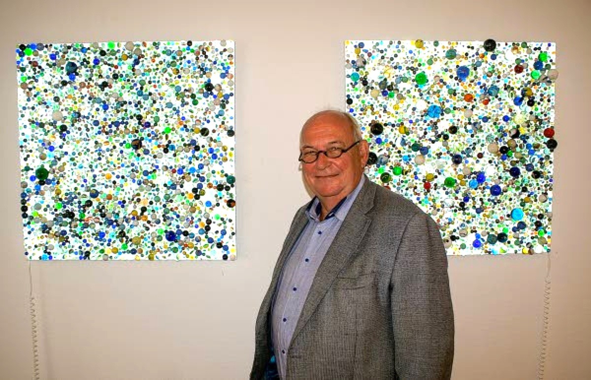 Rob Scholte lijmde knikkers in giethars, wat een hypnotiserend, vlammend effect geeft, mede door het licht aan de achterkant. ‘Licht, je eerste betaalmiddel’ is de titel, omdat kinderen met bommen en knikkers gingen ruilen. ,,Ik hoorde bezoekers hierbij mijmeren en filosoferen over hun jeugd”, licht Emons toe.