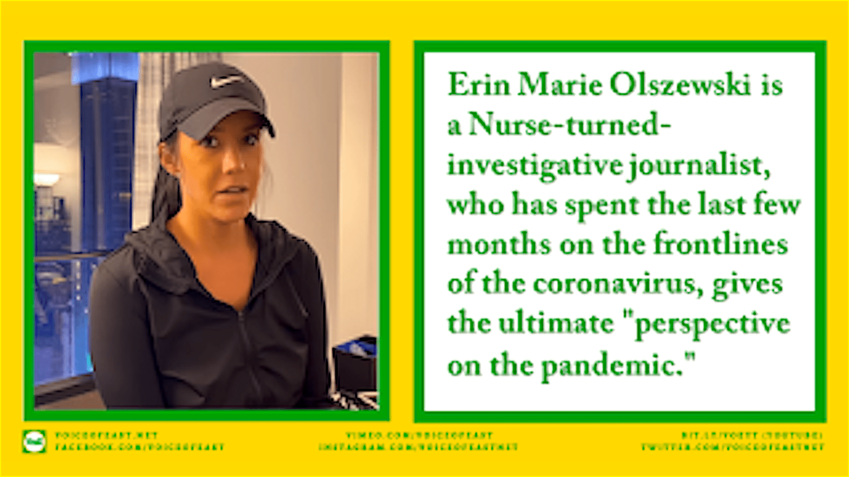 Erin Marie Olszewski is A Nurse turned investigative journalist, who has spent the last few months on the frontlines of the Corona Virus pandemic, on the inside in two radically different settings. Two hospitals. One private, the other public. One in Florida, the other in New York.