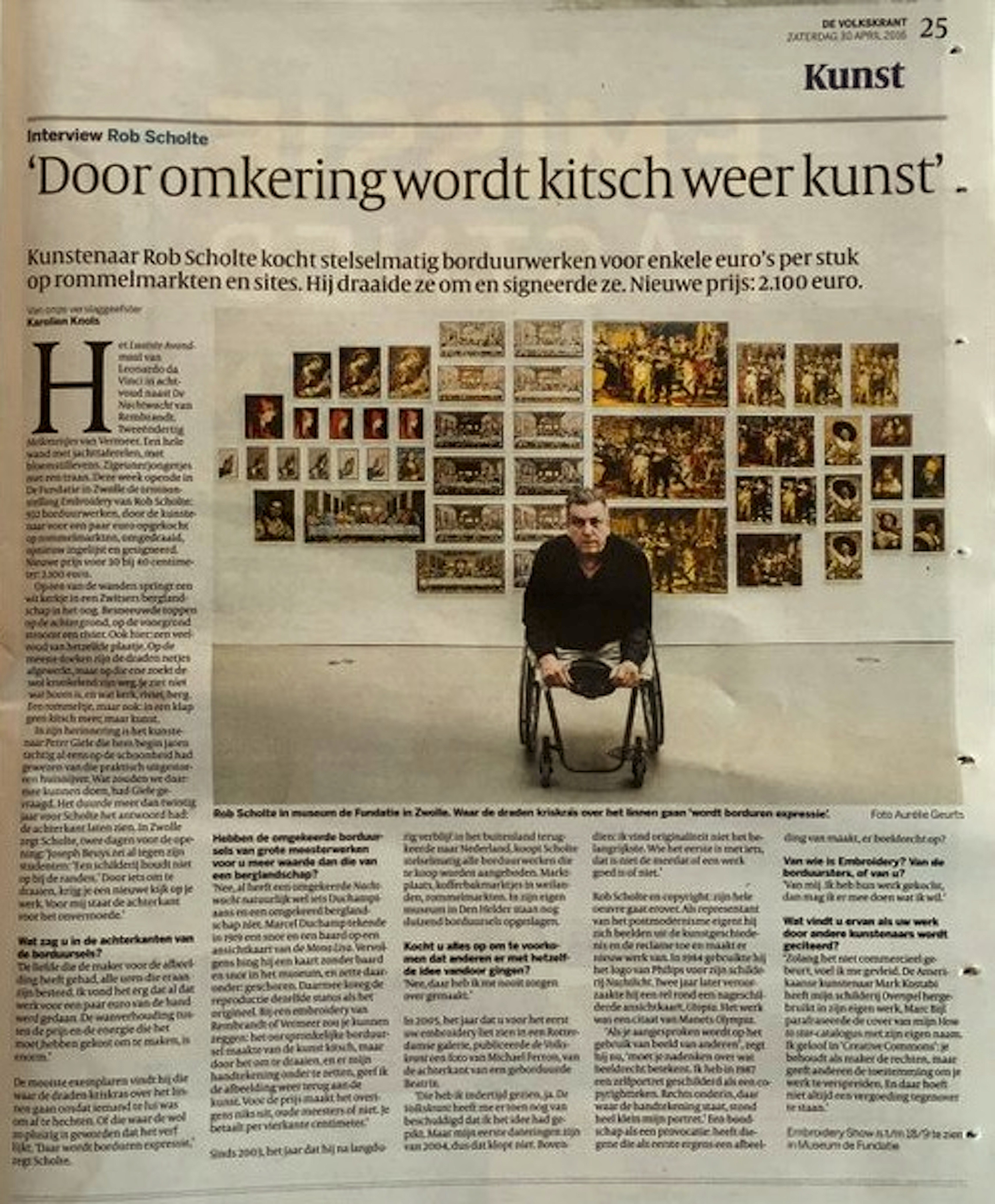 Het Laatste Avondmaal van Leonardo da Vinci in achtvoud naast De Nachtwacht van Rembrandt. Tweeëndertig Melkmeisjes van Vermeer. Een hele wand met jachttaferelen, met bloemstillevens. Zigeunerjongetjes met een traan. Deze week opende in De Fundatie in Zwolle de tentoonstelling Embroidery van Rob Scholte: 932 borduurwerken, door de kunstenaar voor een paar euro opgekocht op rommelmarkten, omgedraaid, opnieuw ingelijst en gesigneerd. Nieuwe prijs voor 30 bij 40 centimeter: 2100 euro.