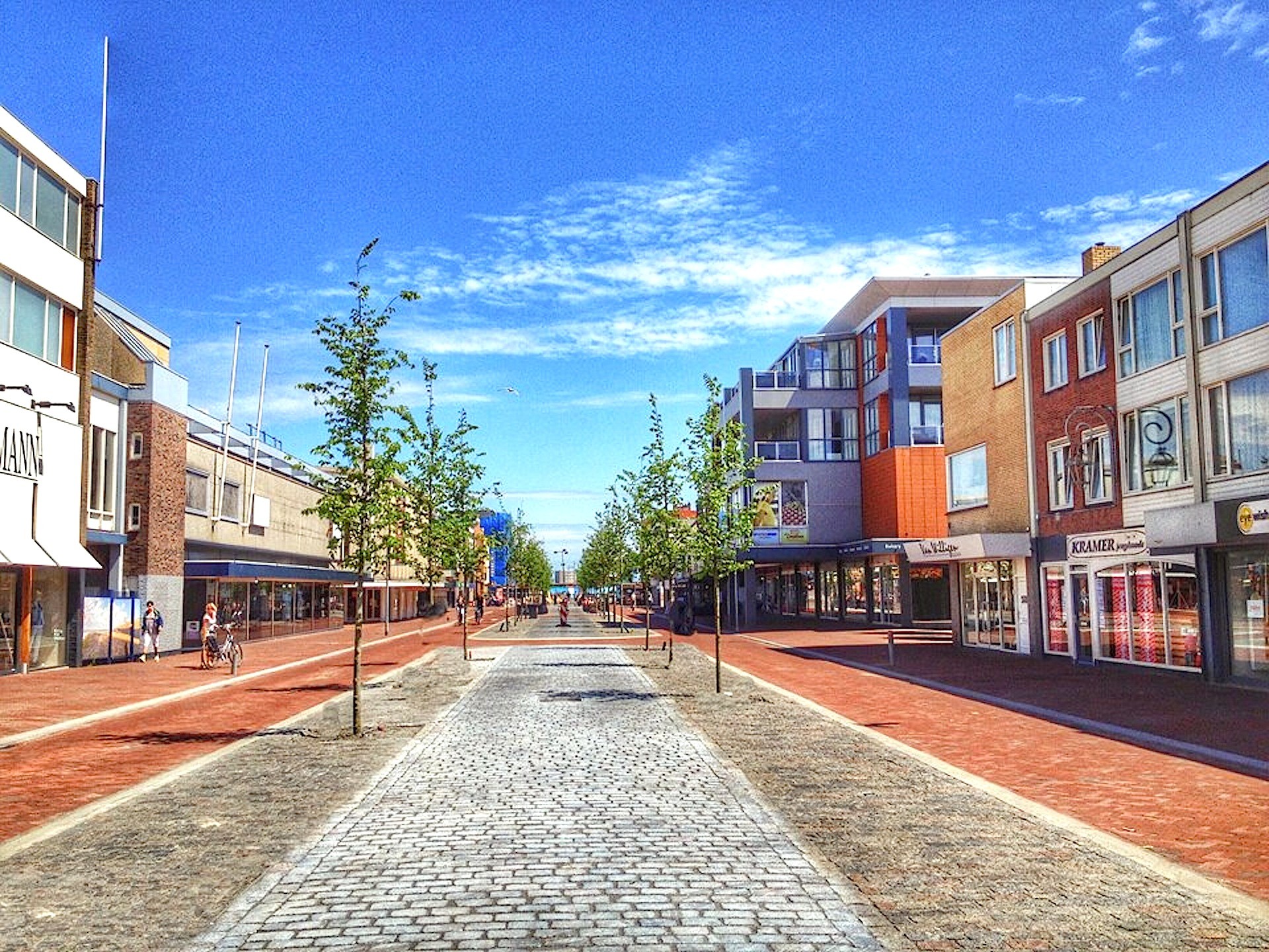 In de lange winkelstraat van de provinciestad aan zee nabij de