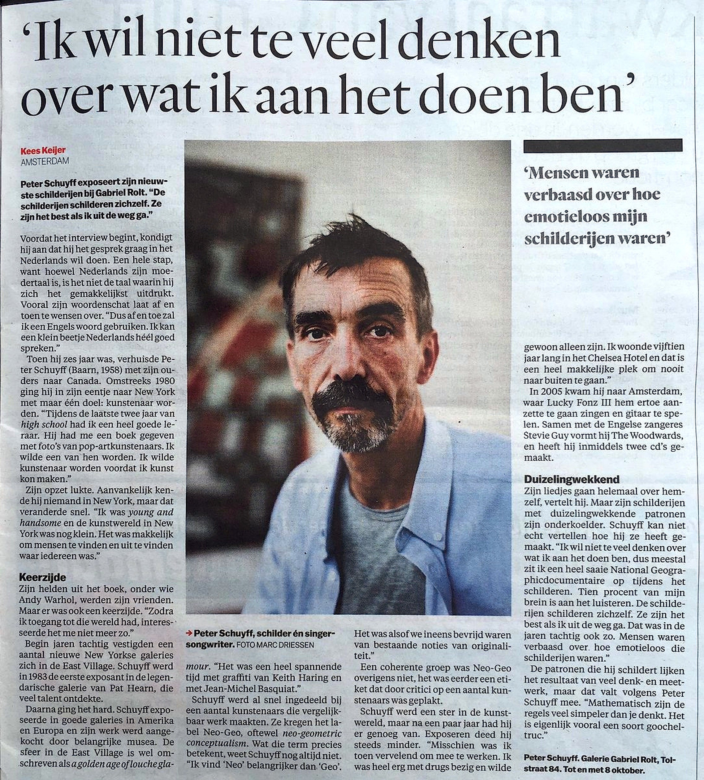 Kees Keijer – Interview met Peter Schuyff: ‘Ik wil niet te veel denken over wat ik aan het doen ben’ 18 november 2016Home, Interview, Locatie, Media, Portretten0 Het Parool, 1 september 2016 http://www.parool.nl/ Dit delen: Afdrukken (Opent in een nieuw venster) Print E-mail een link naar een vriend (Opent in een nieuw venster) E-mail Delen op Pinterest (Opent in een nieuw venster) Pinterest Delen op Bluesky (Opent in een nieuw venster) Bluesky Delen op Nextdoor (Opent in een nieuw venster) Nextdoor Delen op LinkedIn (Opent in een nieuw venster) LinkedIn Delen op WhatsApp (Opent in een nieuw venster) WhatsApp Delen op Threads (Opent in een nieuw venster) Threads Delen op Tumblr (Opent in een nieuw venster) Tumblr Delen op Mastodon (Opent in een nieuw venster) Mastodon Delen op Reddit (Opent in een nieuw venster) Reddit Share op Facebook (Opent in een nieuw venster) Facebook Delen op Telegram (Opent in een nieuw venster) Telegram Delen op X (Opent in een nieuw venster) X