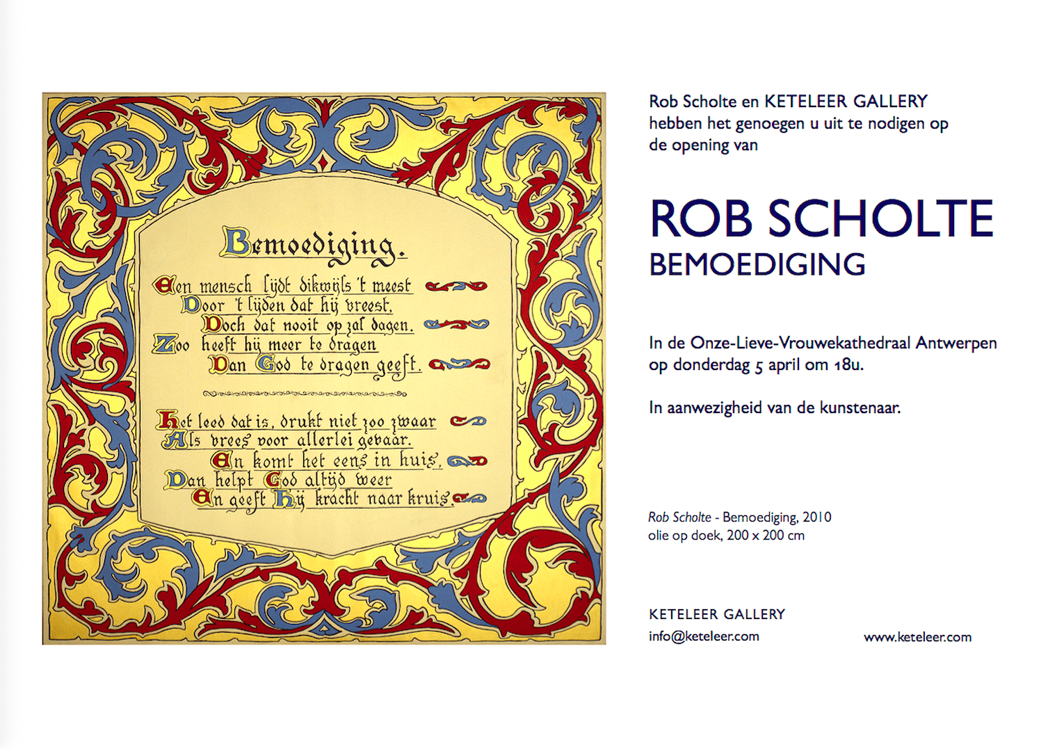 We nodigen u graag uit op de voorstelling van Rob Scholte’s reeks schilderijen ‘Bemoediging’ in de Kathedraal van Antwerpen op donderdag 5 april om 18 u.