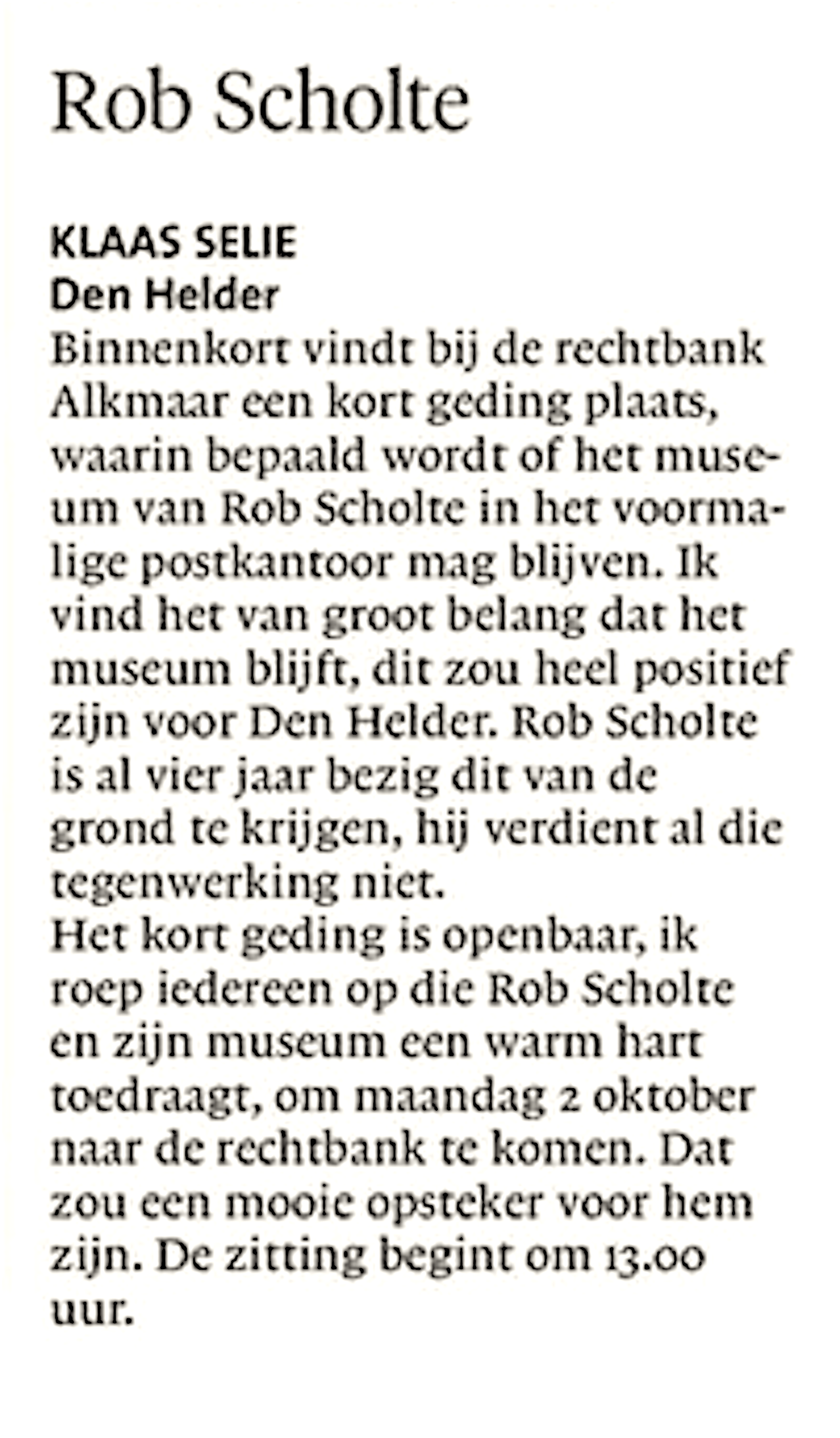 Klaas Selie – Rob Scholte 25 september 2017Businessplan, Home, Locatie, Media0 Helderse Courant, 23 september 2017 https://www.noordhollandsdagblad.nl/den-helder-eo Dit delen: Klik om te delen op Facebook (Opent in een nieuw venster) Facebook Klik om te delen op X (Opent in een nieuw venster) X