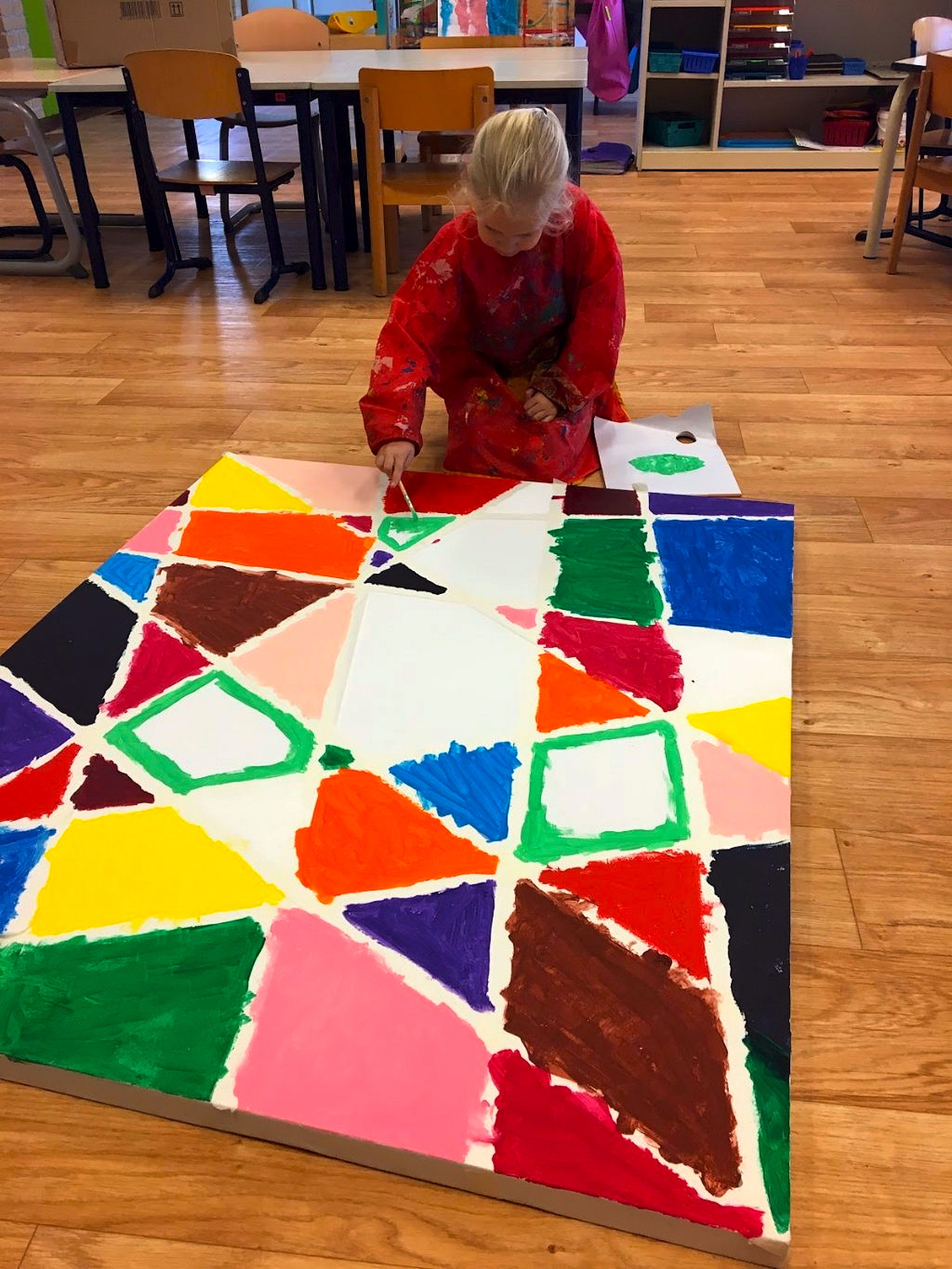 Groep 1d is onze vierde kleutergroep, die is gestart na de kerstvakantie. Hier zitten nog hele jonge kinderen in, “maar ze kunnen al heel veel”, zegt juf Kim. De kinderen maken een eigen museum van autootjes en ze maken een groot kunstwerk met tape en verf. De kinderen kleuren zelf de vlakken in. Ze kunnen dit al heel goed en de tape helpt natuurlijk ook. Sarah uit 1d is op de foto druk bezig met groene verf en maakt zo haar eigen vakje. Alle kinderen hebben een eigen kleur gekozen. Het wordt dus echt een mooi kunstwerk.