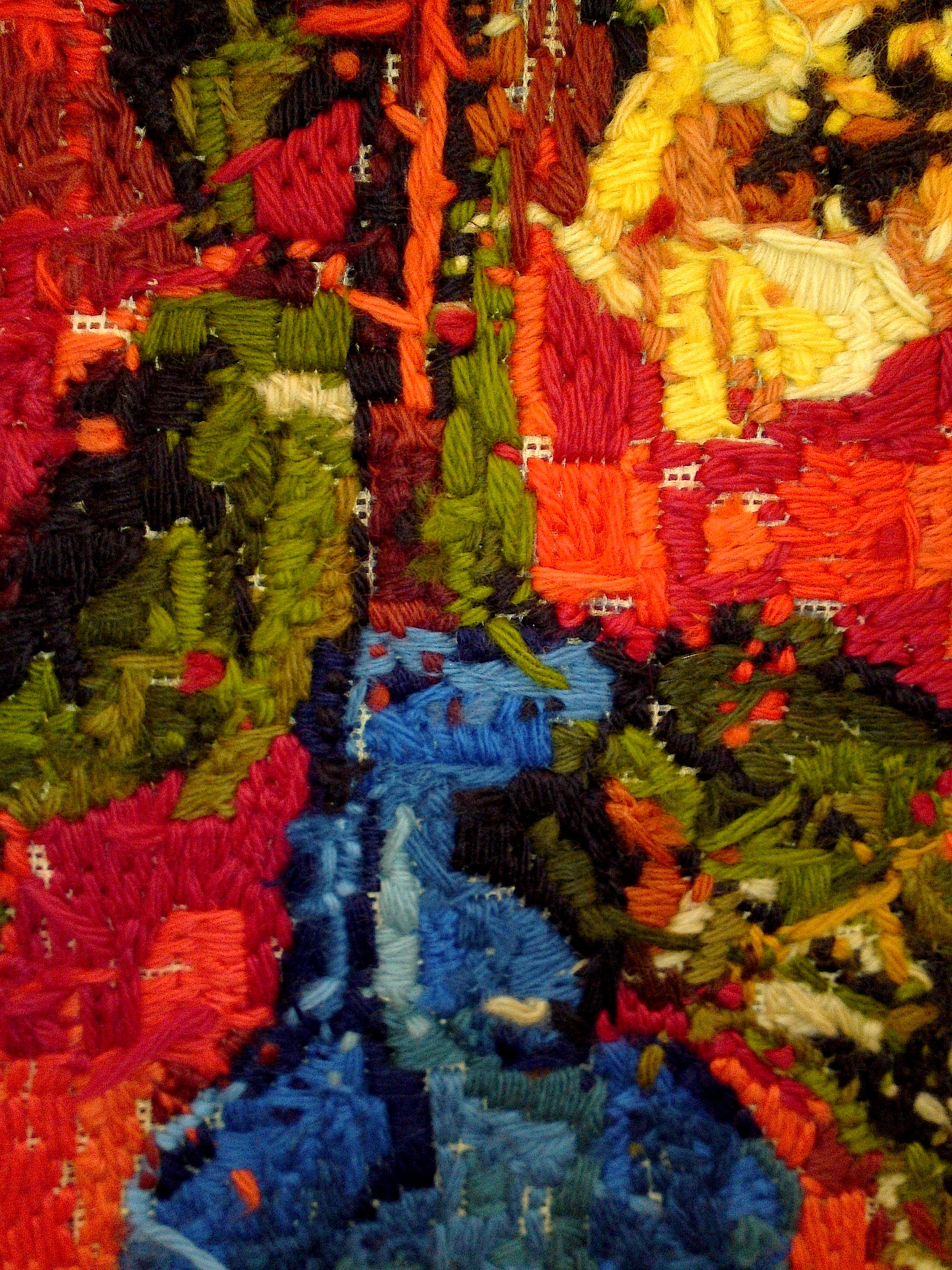 Doordat er hele series van één afbeelding naast elkaar hangen, geborduurd in verschillende materialen (borduurwol, zes draden splijtzijde, drie draden splijtzijde) zie je heel duidelijk wat de materiaalkeuze voor een werk doet. Tel daarbij het feit dat je bij zo’n los gekocht, voorbedrukt stramien zelf de kleuren garen selecteerde, al dan niet met dwingende adviezen van de verkoopster. Zo’n serie laat zien dat materiaal- en kleurkeuze, toegepaste techniek, netheid van werken veel van de sfeer van die achterkanten bepalen. Je ziet ook hoe een technisch probleem is opgelost. Op zo’n voorbedrukt stramien kwam het regelmatig voor dat de scheidingslijn van de kleuren midden over een ‘kruisje’ liep en je moest dan kiezen of je die steek in de ene of in de naastliggende kleur maakte. Zo zie je nu bij het ene werk dat de neus duidelijk groter is geworden dan bij het werk ernaast.
