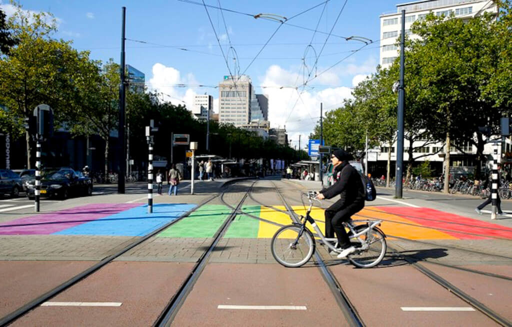 Een regenboog zebrapad in Rotterdam, het kleurrijke zebrapad draagt bij aan de zichtbaarheid van de seksuele diversiteit in de stad (foto NHD)