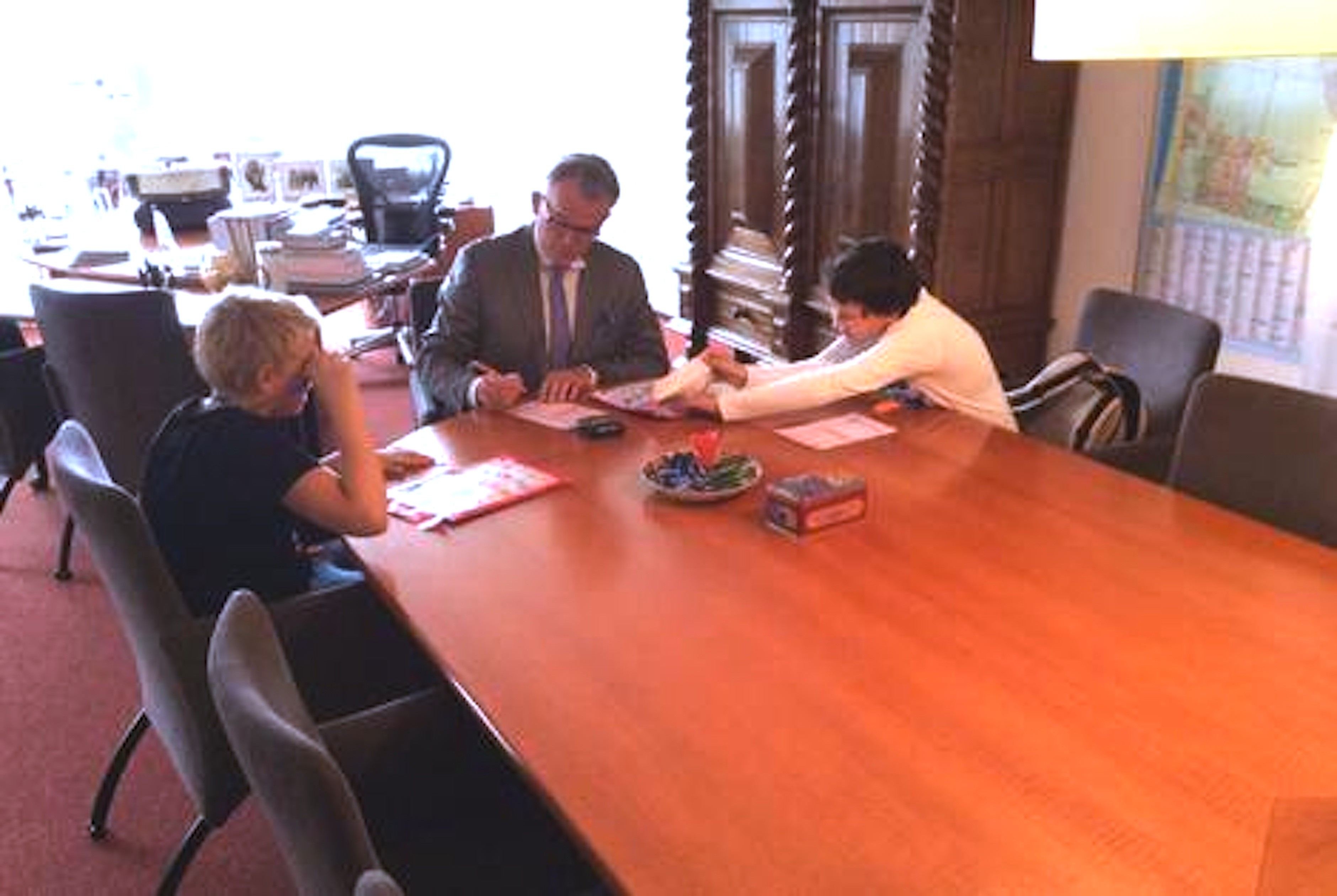 Geen moment twijfelden de twee en spraken hem aan of hij misschien ook iets wilde kopen. ,,Dat wilde hij wel’’, zeggen Dave en Diego waarop ze mee mochten naar zijn werkkamer. ,,Het leek wel een hotelkamer, zo mooi’’, verzucht Dave. Van beide jongens kocht burgemeester Schuiling iets, in ruil daarvoor plakte hij twee roze postzegels op zijn kantoordeur. Het was de allereerste keer dat de burgemeester in functie kinderpostzegels kocht.