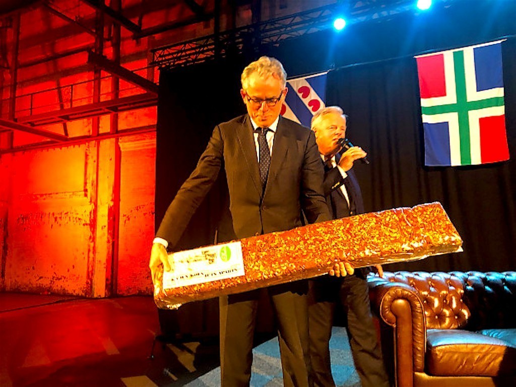 Hij kreeg als dank voor zijn inleiding een plakje koek. Nou, ja: het was meer dan een plak. Het betrof een echte Groninger koek van Knol, van maar liefst anderhalve meter lang. Hij kreeg de koek uit handen van Harm Post, voorzitter van de Commercieele Club Groningen.