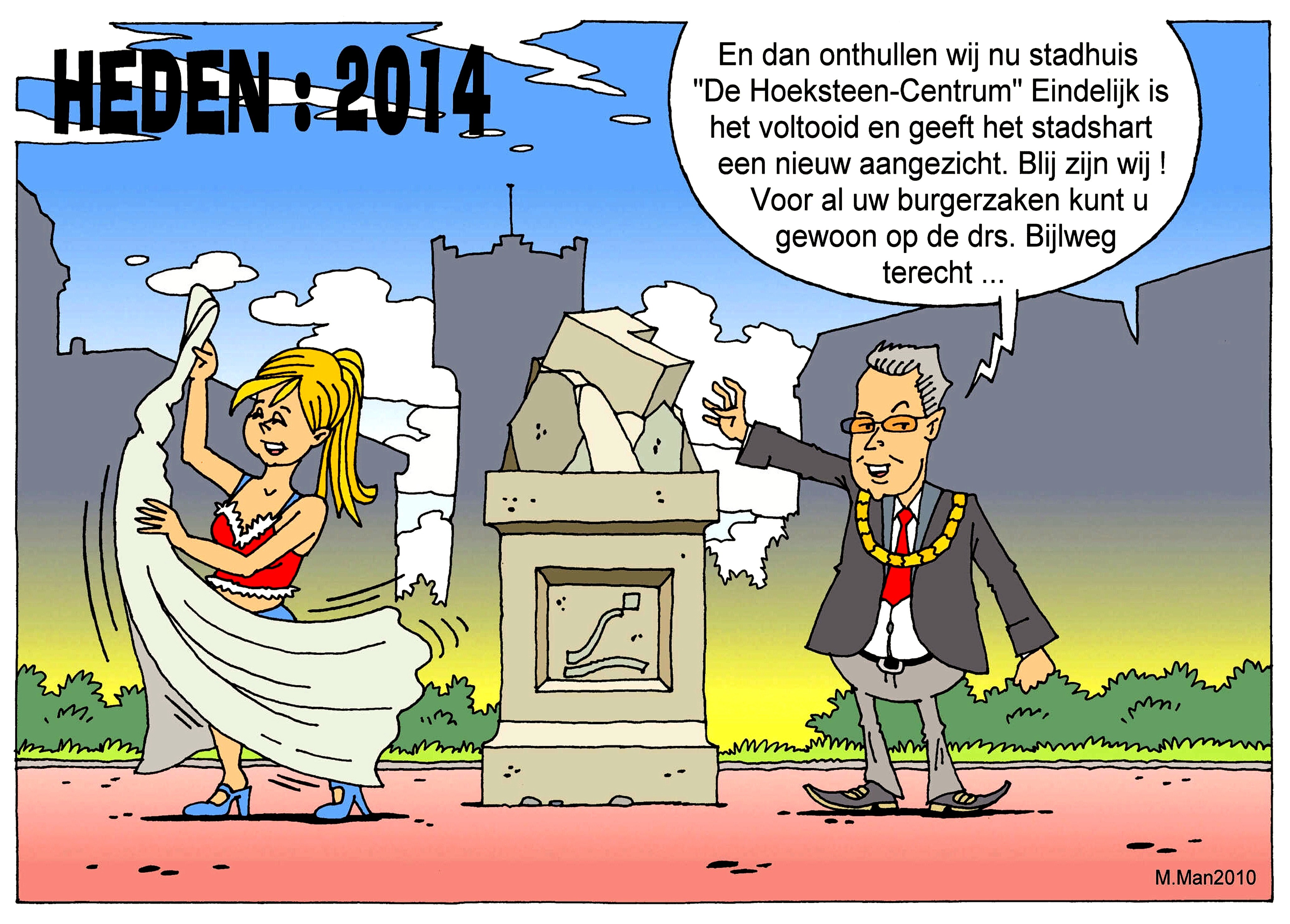 En dan onthullen wij nu stadhuis “De Hoeksteen-Centrum”. Eindelijk is het voltooid en geeft het stadshart een nieuw aangezicht. Blij zijn wij! Voor al uw burgerzaken kunt u gewoon op de drs. Bijlweg terecht…