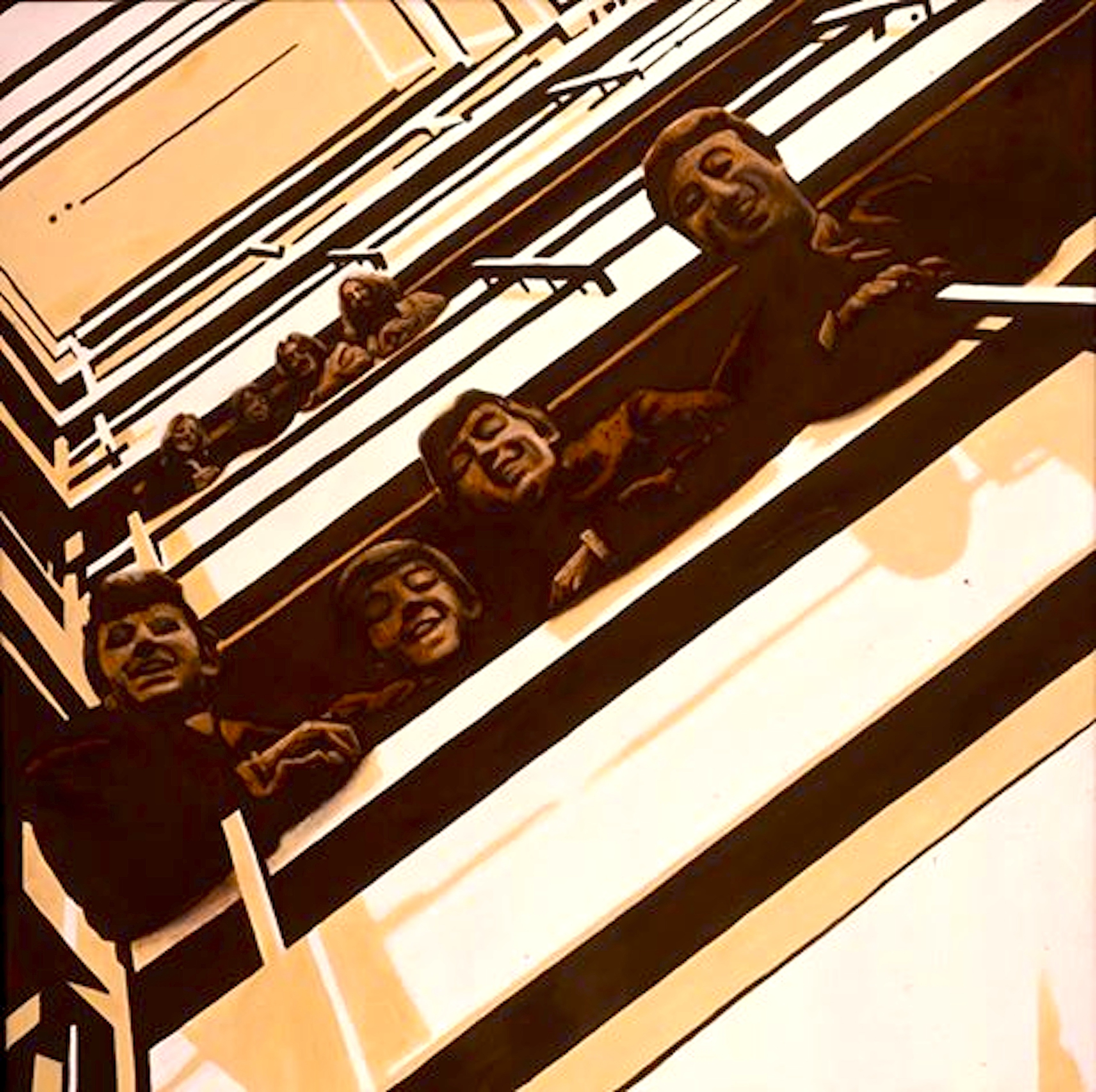 Voor het werk ‘Strawberry Fields Forever’ baseert Scholte zich op de platenhoes van ‘Please Please Me’ van The Beatles. De coverfoto werd in 1962 gemaakt door Angus McBean (1904-1990) in het trappenhuis van het EMI-hoofdkantoor in Londen. Ze kijken over de railing naar beneden. Zeven jaar later maakte McBean een tweede versie van deze foto, met de daarop ouder geworden muzikanten. Deze twee beelden worden door Scholte samengevoegd op het doek: een etage boven de jonge Beatles zijn hun volwassen evenbeelden te zien.