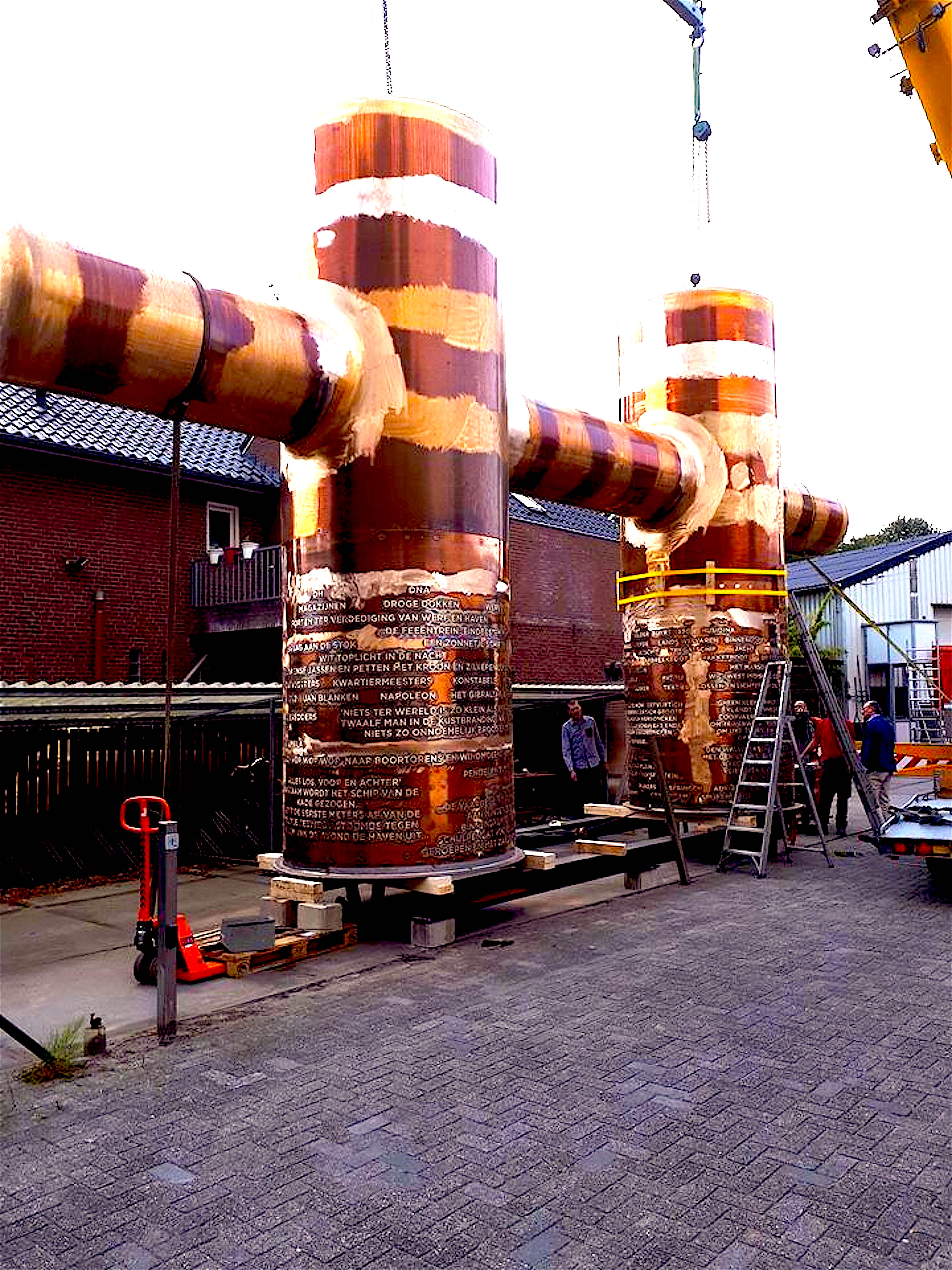 De Dubbele Bolder, zoals het kunstwerk heet, is in verschillende stukken vervaardigd en in Helmond tot een geheel gemaakt. In één stuk wordt het stadsbeeldmerk over de weg naar het noorden vervoerd. En dus moest het convoi exceptionnel onderweg ook door tunnels, over bruggen en door bochten. Twee hijskranen stonden vanmorgen in alle vroegte klaar om de gigantische symmetrische H-vorm op zijn plek te hijsen.