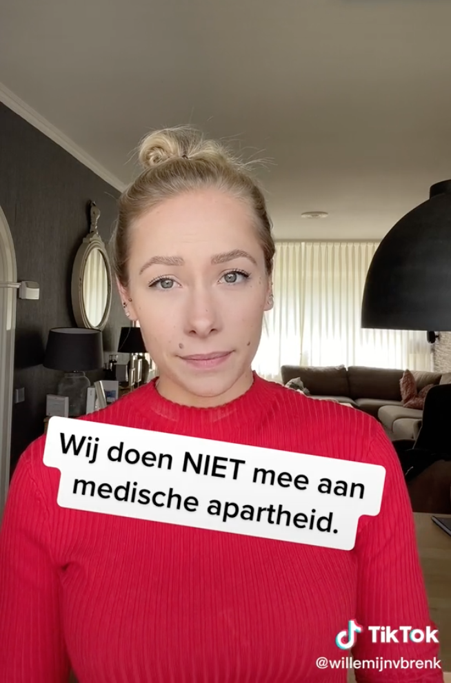 “Ik heb dan ook besloten om Uit Persoonlijke Titel de Volgende Mededeling te doen. Wij doen niet mee aan Medische Apartheid. Wij doen niet mee aan Medische Discriminatie,” benadrukt ze. Wij hebben Nog Nooit Iemand Hier Geweigerd op Basis van Geloofsovertuiging, Seksuele Geaardheid, Seksuele Voorkeur of Medische Achtergrond. Dat gaan wij In de Toekomst ook Niet doen.”