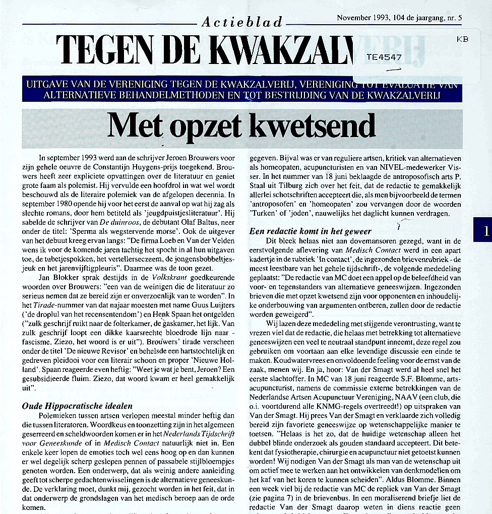 Heden bied ik u een lap tekst, die bestaat uit fragmenten, flitsen en invallen. U, die de vaderlandse letteren lief heeft, dat heerlijke geordende Hollandse letterland waarin het zo knus en veilig wonen is (calvinisme, H.B.S. grachtengordel) houdt maar meteen op met lezen. Keer terug naar al die binnen broekse rukkers, die bijvoorbeeld een Indisch kampverleden bij elkaar hebben gefantaseerd, of zwijmelend neerliggen op een bed violen. Of erger nog: A.F.Th. .