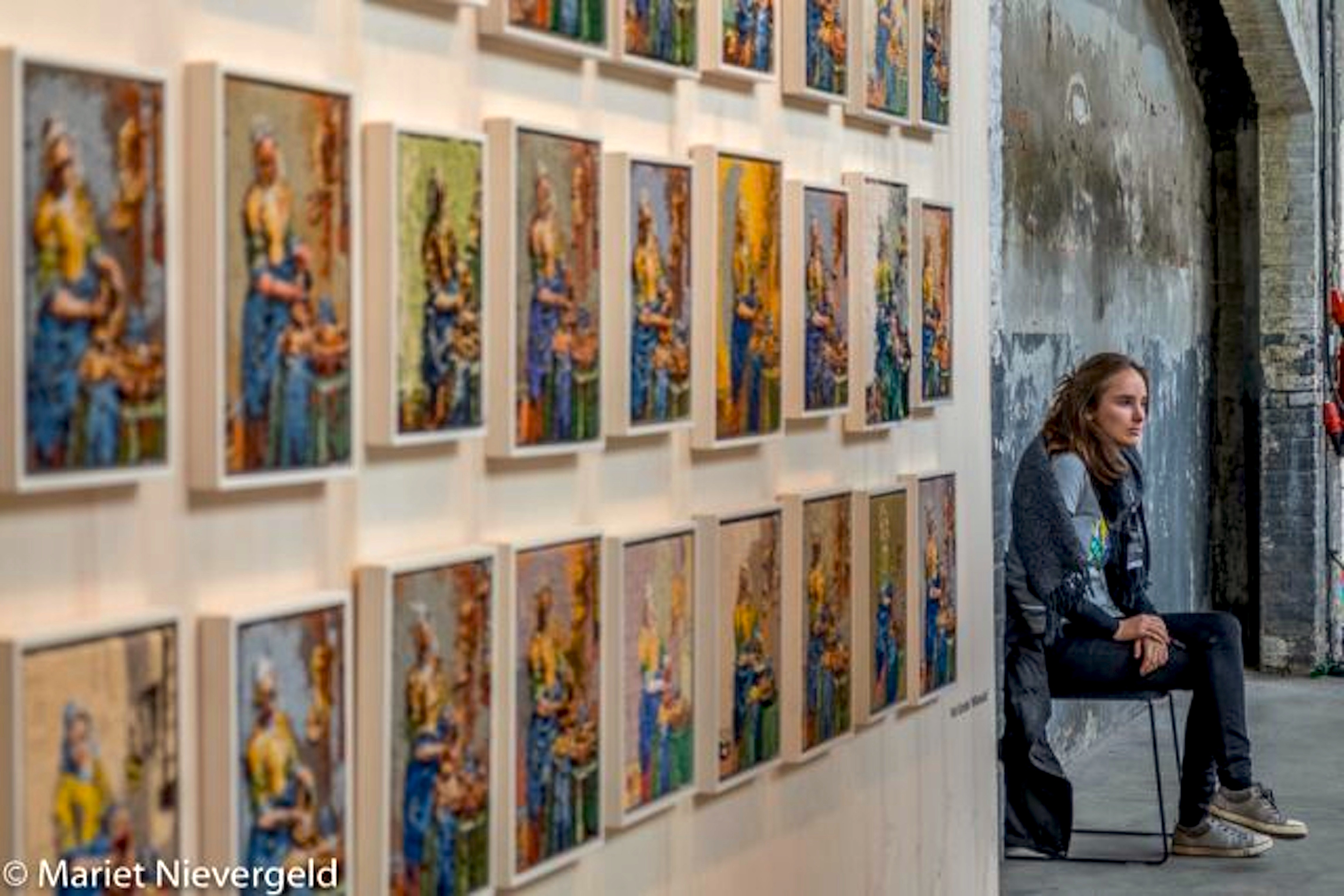 Als laatste weer alle eer voor een vrijwilliger die suppoost is bij de wand met geborduurde “melkmeisjes” van Vermeer. Overigens gaat het om de achterkanten van de borduurwerkjes. Door Rob Scholte in witte lijsten gezet, waardoor het geheel een fascinerend kunstwerk is geworden.