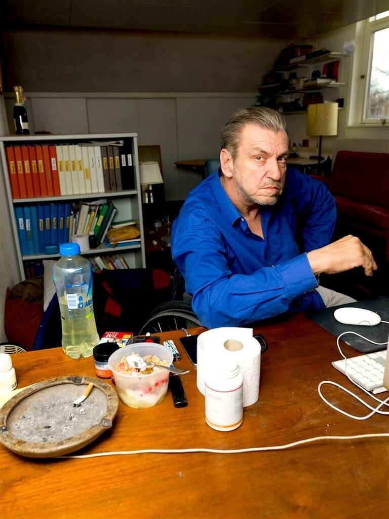 ‘Vanaf mijn geboorte heb ik nooit een keuze gehad. Ik ben voorbestemd om te doen wat ik doe. Wat mijn benen betreft: dat die eraf zijn is een kroning. Er is een doop geweest in de Jordaan: ik ben de immobiele koning, dat is allemaal georganiseerd, dat is georganiseerde pijn, die niet nodig was. Als je mij astraal fotografeert is mijn lichaam helemaal intact, dan heb ik gewoon nog steeds benen.’