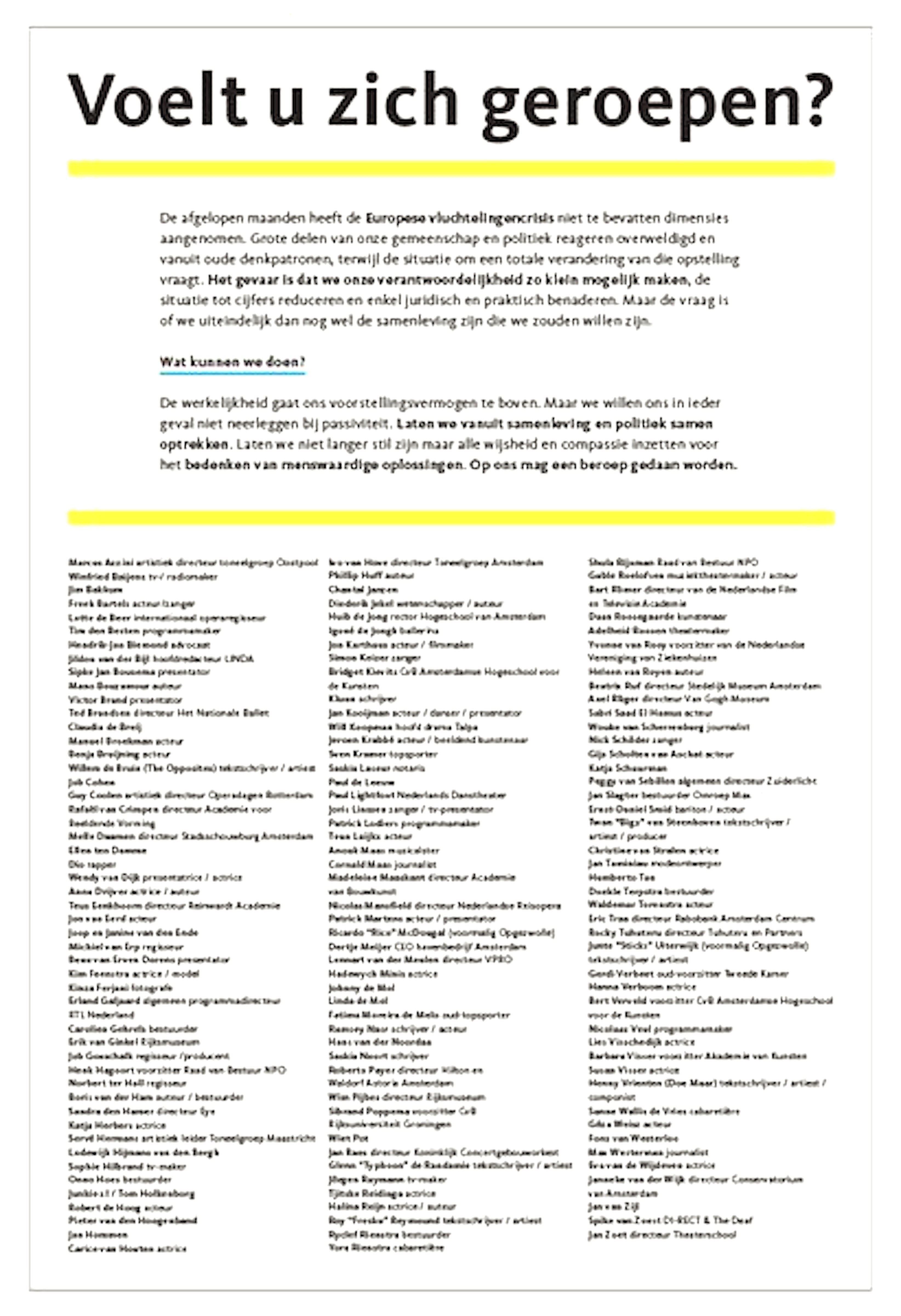 In een paginagrote advertenie in De Telegraaf riep een grote groep bekende Nederlandes afgelopen september op om met elkaar iets te doen voor de Europese vluchtelingencrisis. Onder de advertentie staan ruim honderd namen van onder anderen Linda en Johnny de Mol, Wendy van Dijk, Carice van Houten en Claudia de Breij.