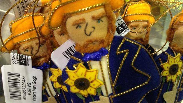 Maar ik zag dat ook Van Gogh zelf – genie, hoerenloper, ruziezoeker – hier nu te koop is als stoffen poppetje. Met wild rood haar bungelt hij aan sleutelhangers, soms romantisch met een zonnebloem in zijn hand. In een grabbelbak ligt hij ook, zijn jasje en gele hoed met goud doorstikt. Alleen een Action Man-versie ontbreekt nog.
