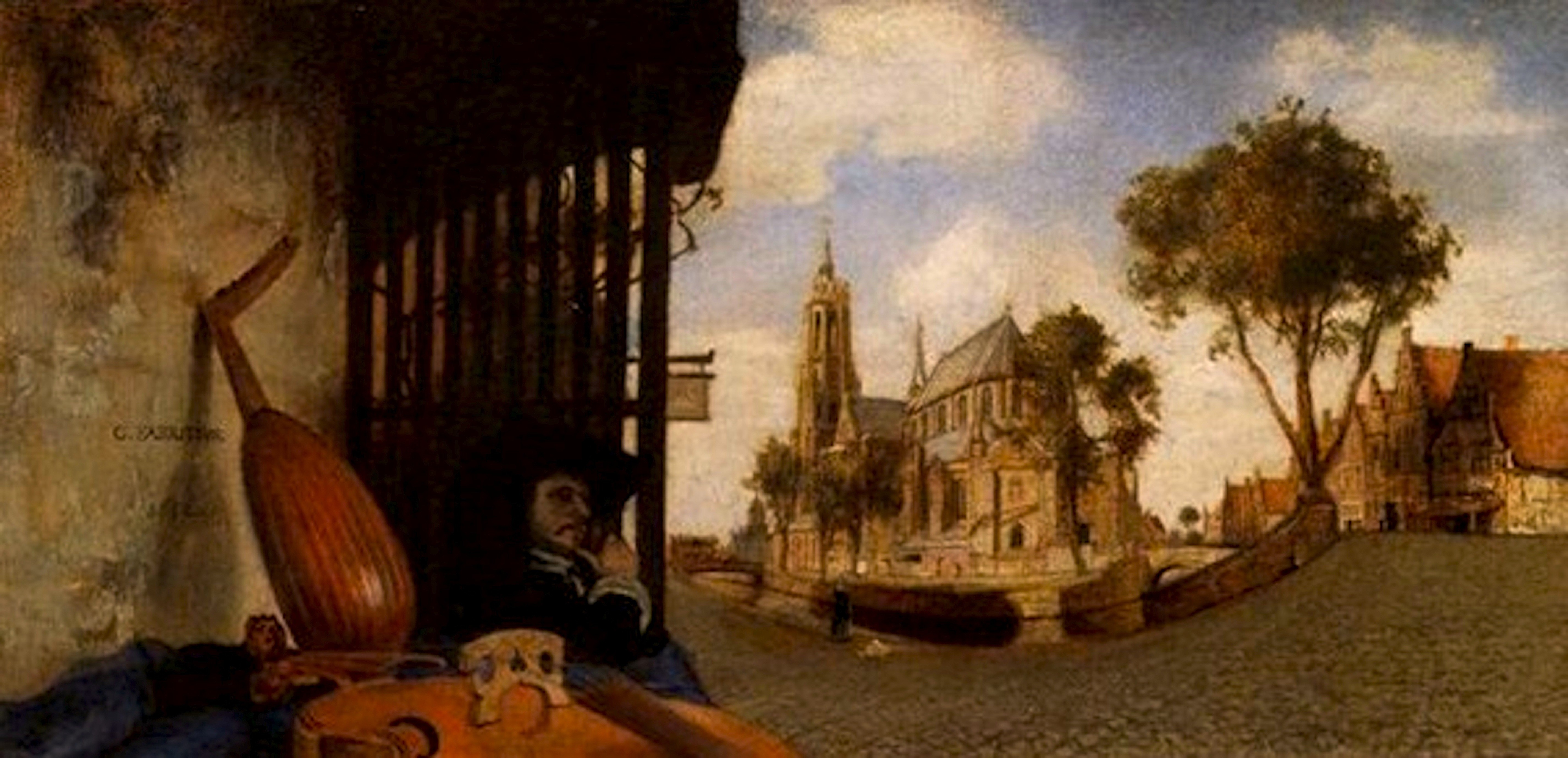 Het werk van Fabritius is in ons denkbeeldige museum op een halfronde achterwand aangebracht. Door de correctie van het vertekende perspectief die hierdoor plaatsvindt vormt de muur waartegen de instrumentenverkoper zit een logische voortzetting van een echte muur, namelijk de zijwand links van ons in de echte ruimte. Bij Romano ontvouwt zich een weidsere ruimte achter de pilaren, de brekende pilaren die we onwillekeurig ook nog een beetje ervaren als deel van ‘onze’ echte wereld. Bij Fabritius werkt de illusionistische voortzetting van de echte muur links in de schildering op vergelijkbare wijze. We ervaren suggestief alsof die muur nog bij ‘onze’ wereld hoort vanwege de verbinding met de echte zijwand links van ons. Het werkt samen met de viool en de kleine ruimte waarin we ons met de verkoper lijken te bevinden. Door de suggestieve overbrugging die deze elementen vormen tussen realiteit en geschilderd illusionisme wordt ‘onze’ realiteit overtuigend uitgebreid met de geschilderde waar we ons deel van gaan voelen, ontvouwt zich achter deze elementen het weidse stadsgezicht en lijkt de ruimte waarin we ons bevinden veel groter dan die in werkelijkheid is. Met een duizelingwekkende ervaring van ruimte tot gevolg. Om met van Hoogstraten zijn woorden1 te spreken, de ruimte is met ‘wegwijkende doorzigten’ vertoverd tot een ‘wijdstrekkend veld’.