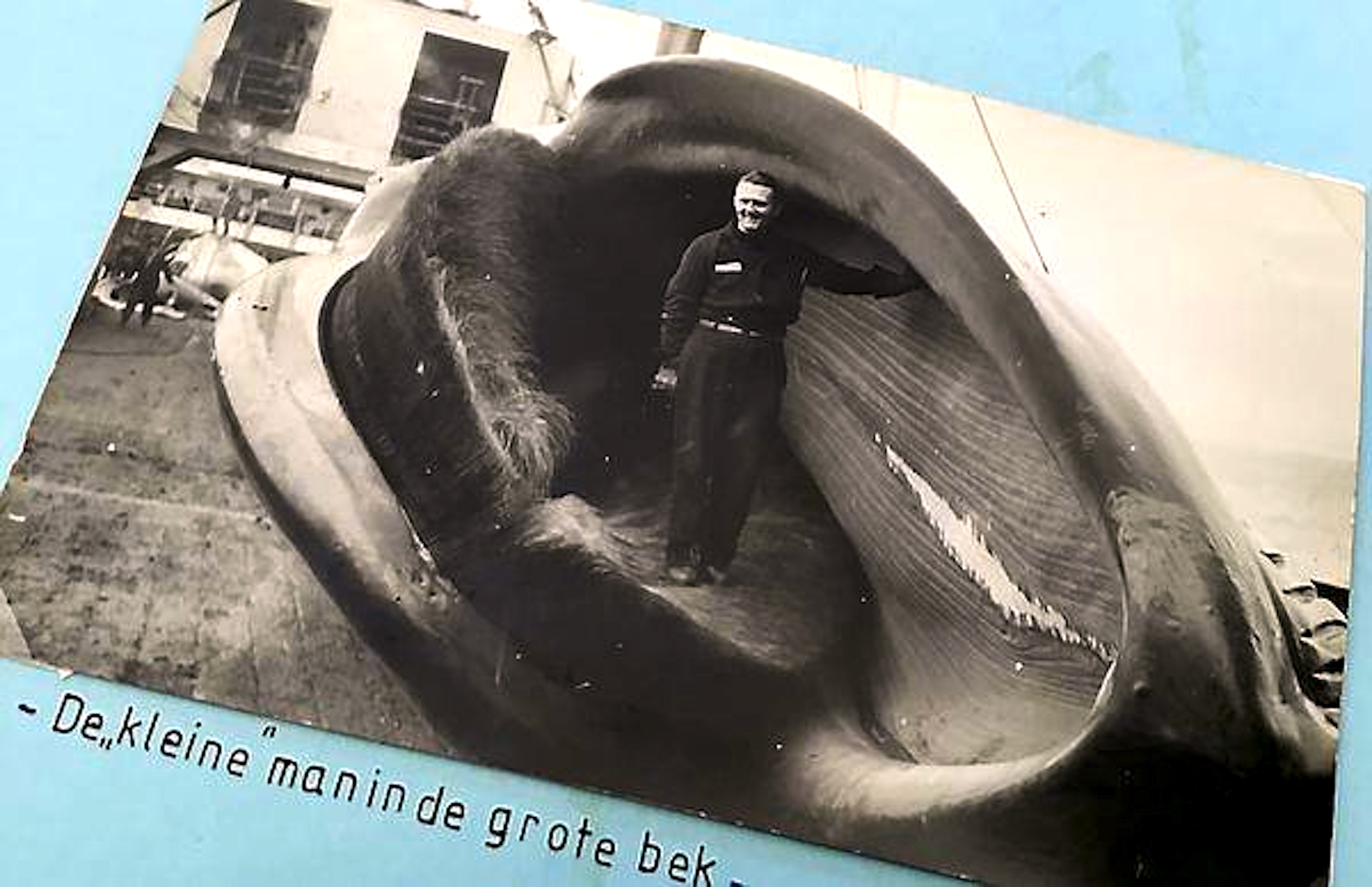 Hij staat op een sokkel in de voormalige winkelruimte onder zijn woning. Een winkeltje op een hoek aan de Ooievaarstraat, waar zijn vader in de jaren dertig al een slagerij had, hij zelf nadien de slagershanden uit de mouwen stak en waar vervolgens zijn dochter jarenlang een kapsalon dreef. Toen zij om gezondheidsredenen moest stoppen met de salon en het pand leegkwam, begon er langzaam aan iets te borrelen bij de walviskenner. Waarom zou hij er zijn collectie niet in uitstallen? En dan ook maar een naam op het raam. De keuze viel op ’De harpoen’.