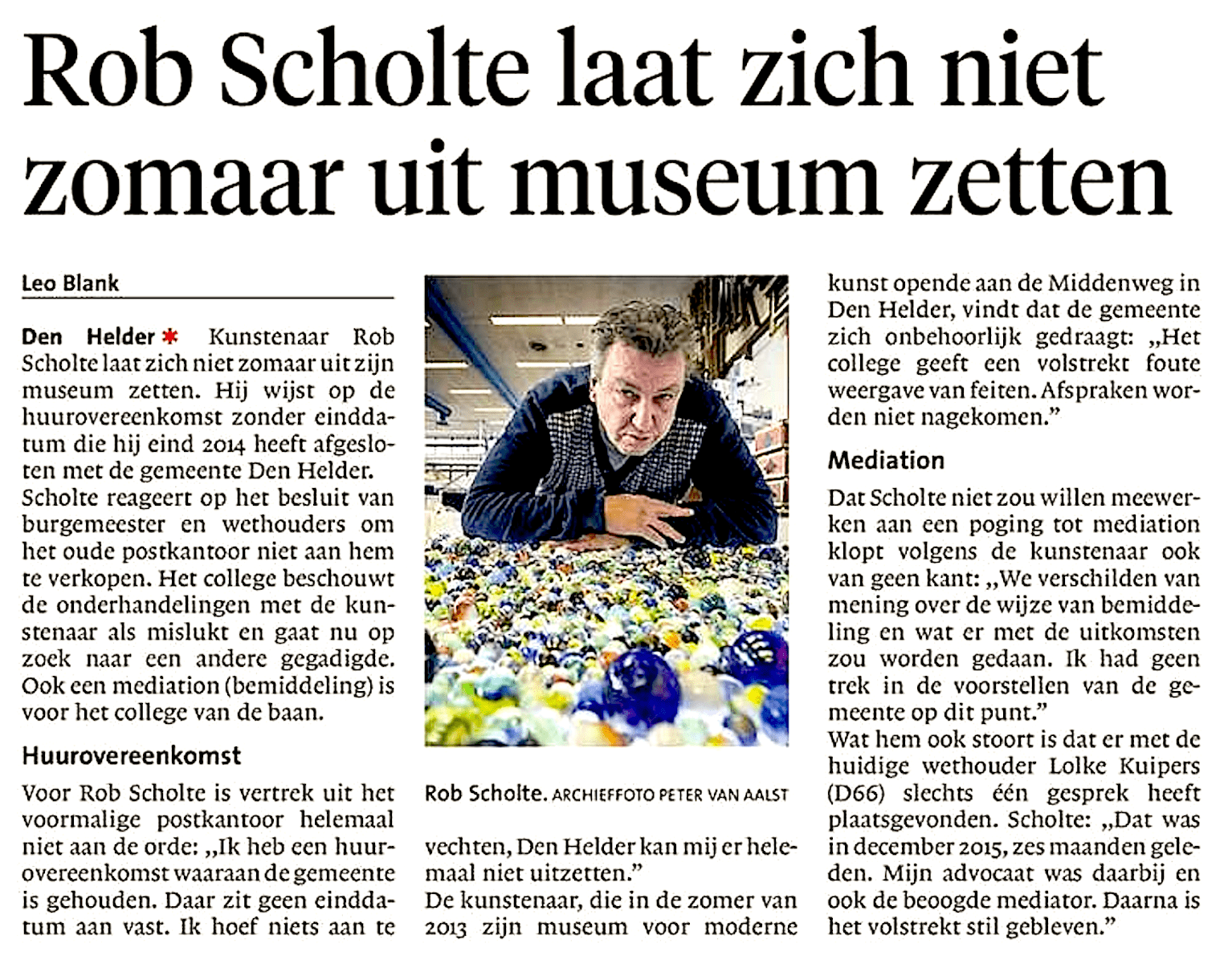 Nee, dat door Blanks handelen allerlei zaken feitelijk onjuist zijn weergegeven, maakt het NHD niet uit. Fouten als bijvoorbeeld, dat het enige gesprek tussen wethouder Lolke Kuipers en Scholte, zoals staat gepubliceerd in het NHD van 10 juni 2016 (http://www.noordhollandsdagblad.nl/stadstreek/denhelder/article28176845.ece/Rob-Scholte-laat-zich-niet-zomaar-uit-museum-zetten?lref=SR_1) niet in december 2015, maar pas op 27 januari 2016 plaatsvond. Ach, een kniesoor, die maalt om een dergelijke foutieve rapportage. Daar vloeit geen bloed over.