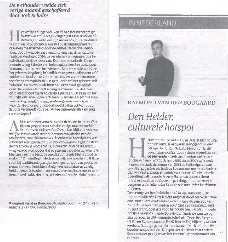 De naamgever heeft zichtbaar lol in zijn museum. “De meesten willen in Den Helder nog niet dood gevonden worden, maar het is hier fantastisch: de meeste zonuren van Nederland, aan drie kanten zee”. Zijn aanwezigheid, zegt hij met recht, doet iets voor het tot nu toe niet als culturele hotspot bekend staande Den Helder. Sinds de aanslag in 1994 woonde Scholte in Tenerife, Bergen (N.H.) en Egmond aan de Hoef. Hier wil hij blijven: “Lekker werken. Dat mijn geest hier rondwaart. Dat ik er ben”. Wethouder Jacqueline van Dongen ziet dat sinds kort anders: Scholte moet per 1 januari a.s. het voormalige postkantoor ontruimen.