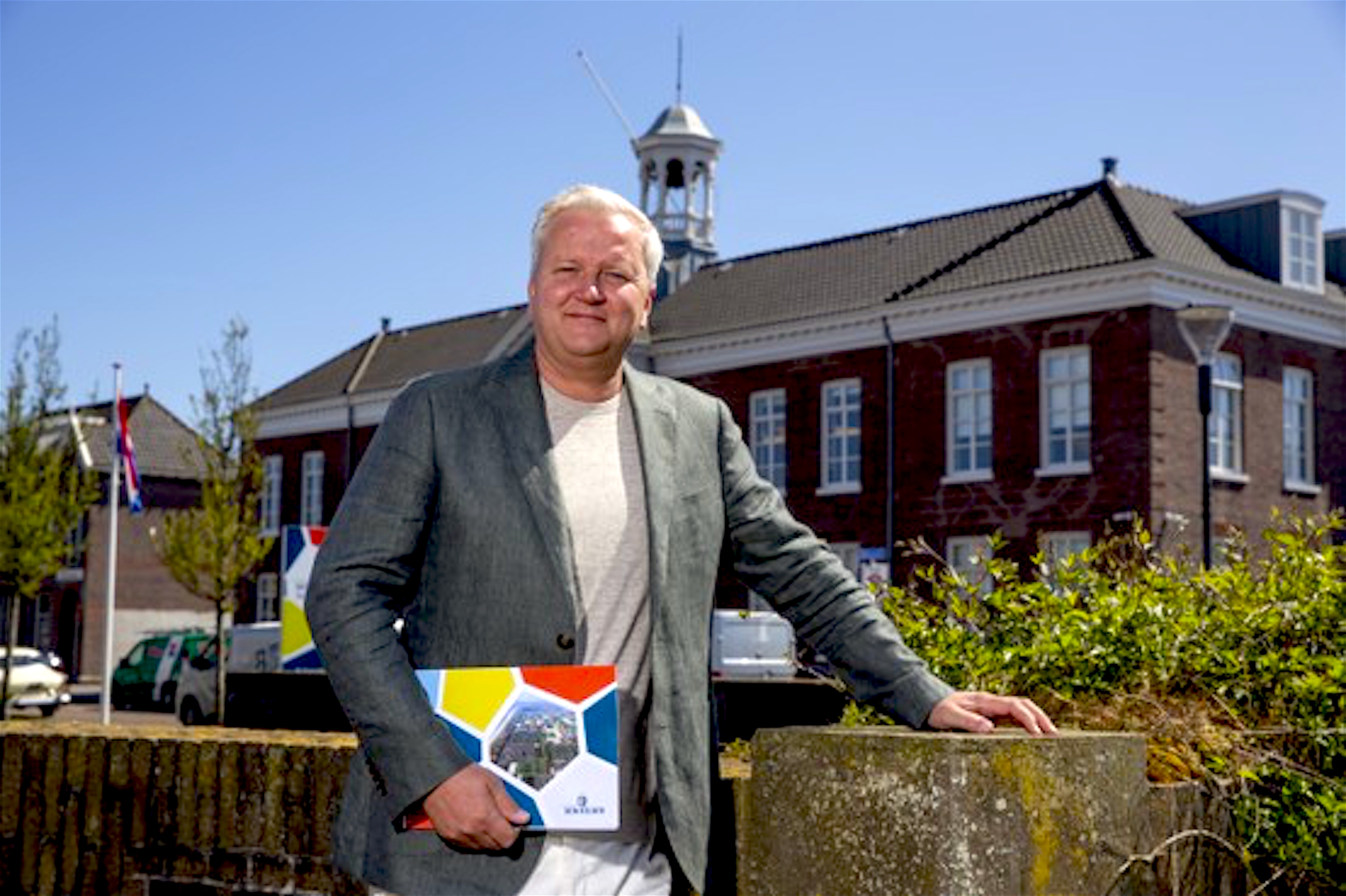 Wethouder Kees Visser met onder zijn arm de Kadernota, poserend voor het stadhuis aan de Kerkgracht (foto Peter van Aalst)