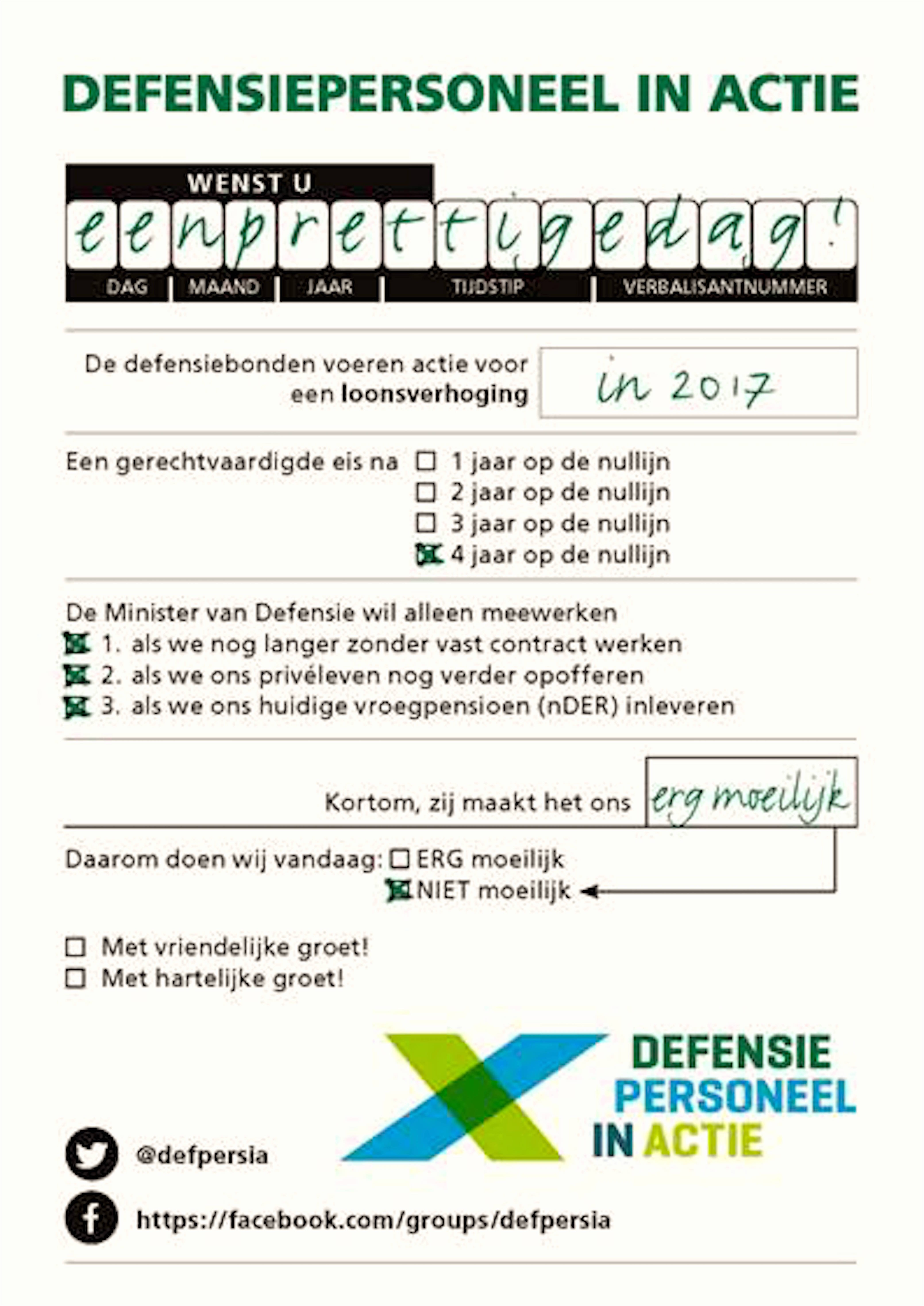 Belangrijker dat het fileren van bovenstaande tekst vind ik dit; De politie heeft in het verleden bij een CAO conflict wel eens opzettelijk files veroorzaakt en automobilisten expres lang langs de kant van de weg gezet. Met dat soort acties jaag je zelfs de grootste fans van betere arbeidsvoorwaarden (zoals ik) tegen je in het harnas. Acties van de Marechaussee zijn extra riskant. Maar met een beetje het koppetje erbij is er van alles te bedenken. Als de acties publieksvriendelijk zijn en opsporingsambtenaren hun bevoegdheden niet misbruiken, dan sta ik VIERKANT achter de acties. Vier jaar geen CAO en de totale afbraak van defensie zijn een bloedschande.