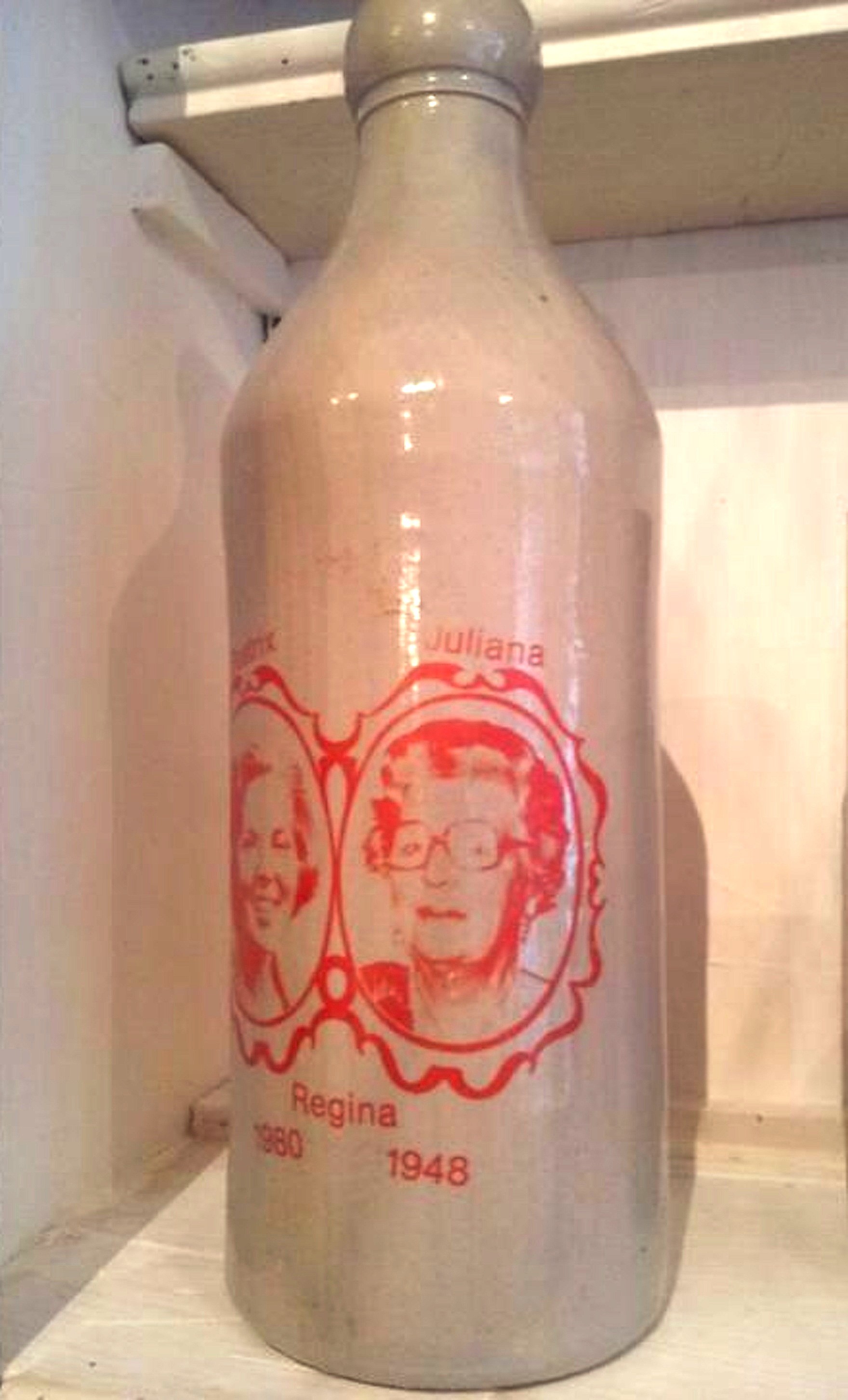 Herdenkingsfles van steen met opschrift Beatrix Juliana Regina 1980 1948.