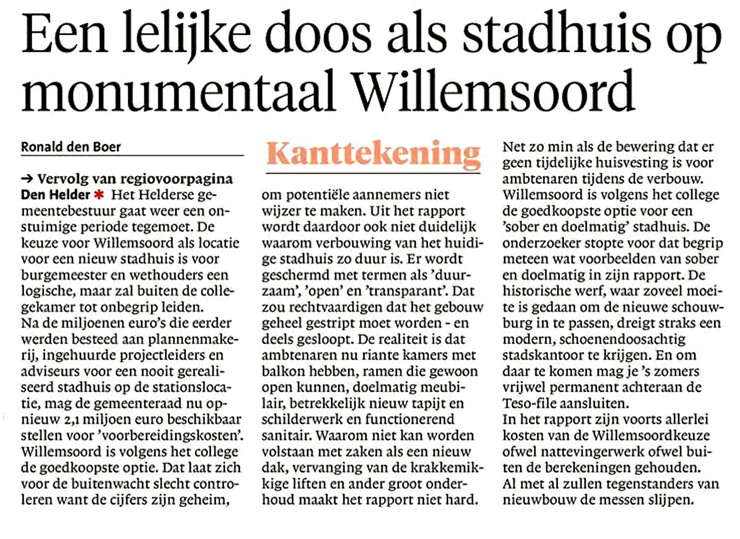 Ronald den Boer – Kanttekening: Een lelijke doos als stadhuis op monumentaal Willemsoord 12 februari 2016Businessplan, Home, Locatie, Media0 Helderse Courant, woensdag 10 februari 2016 http://www.noordhollandsdagblad.nl/stadstreek/denhelder/ Dit delen: Klik om te delen op Facebook (Opent in een nieuw venster) Facebook Klik om te delen op X (Opent in een nieuw venster) X