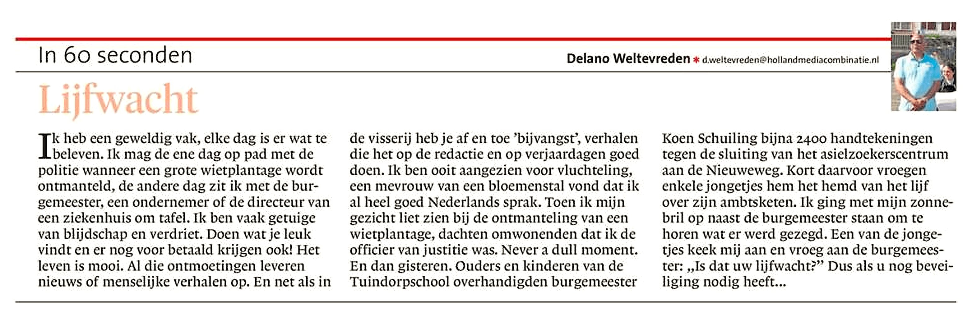 Delano Weltevreden – Lijfwacht 3 juni 2017Businessplan, Home, Locatie, Media, Portretten0 Helderse Courant, 2 juni 2017 https://www.noordhollandsdagblad.nl/den-helder-eo Dit delen: Klik om te delen op Facebook (Opent in een nieuw venster) Facebook Klik om te delen op X (Opent in een nieuw venster) X