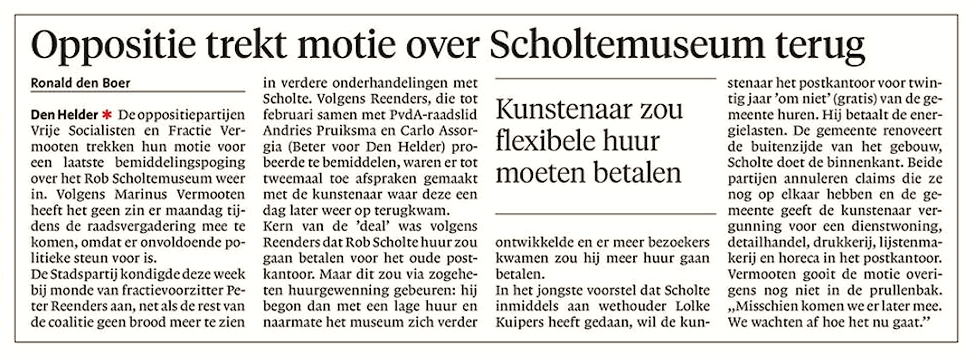 Ronald den Boer – Oppositie trekt motie over Scholtemuseum terug 9 april 2017Businessplan, Home, Interview, Locatie, Media0 NHD, 8 april 2017 https://www.noordhollandsdagblad.nl/den-helder-eo Dit delen: Klik om te delen op Facebook (Opent in een nieuw venster) Facebook Klik om te delen op X (Opent in een nieuw venster) X