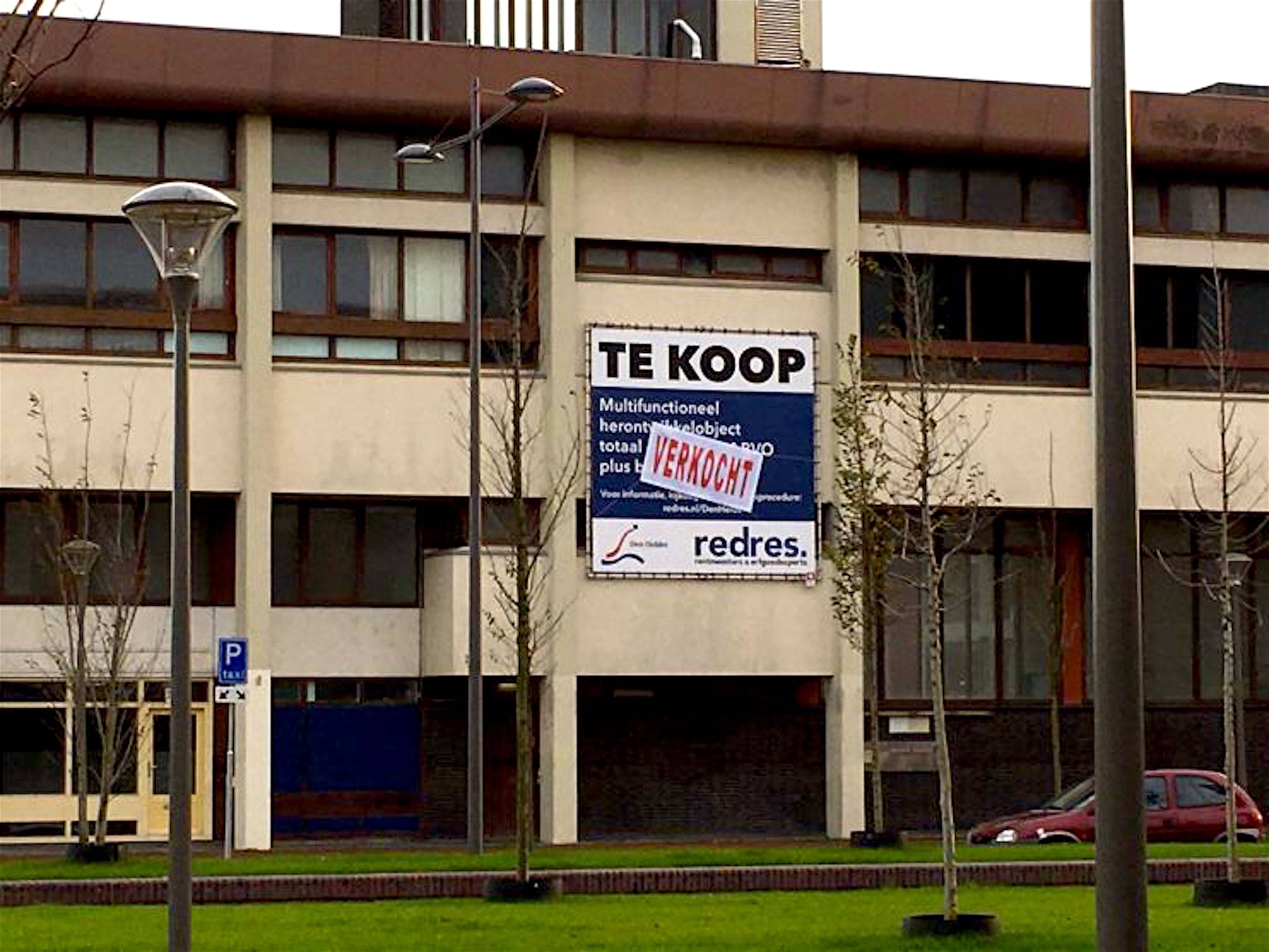 Opnieuw hangt dit weekend het affiche ’verkocht’ op het verkoopdoek van vastgoed makelaar Redres aan de gevel van het voormalige postkantoor langs de Middenweg.