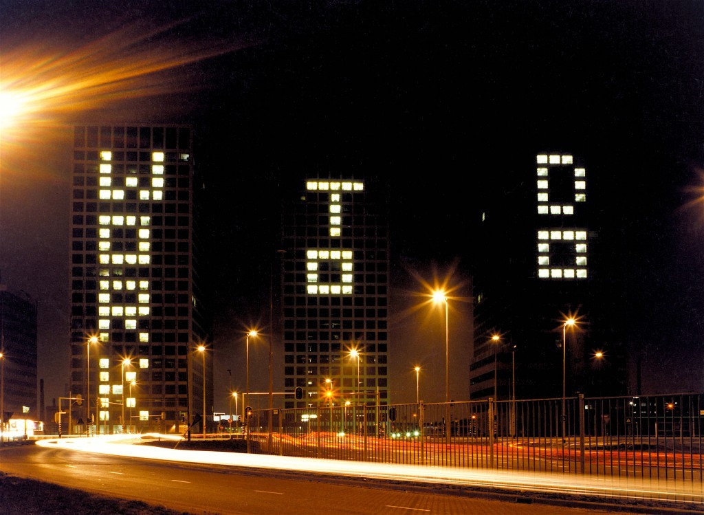 Through an arrangement of the lighting in the various units, I managed to illuminate the words ‘work to do’ in the windows of the three tower blocks of the Europoint Complex, Marconiplein, Rotterdam. This text became gradually brighter as the evening grew darker and was, because of its favourable location, visible from a great distance.