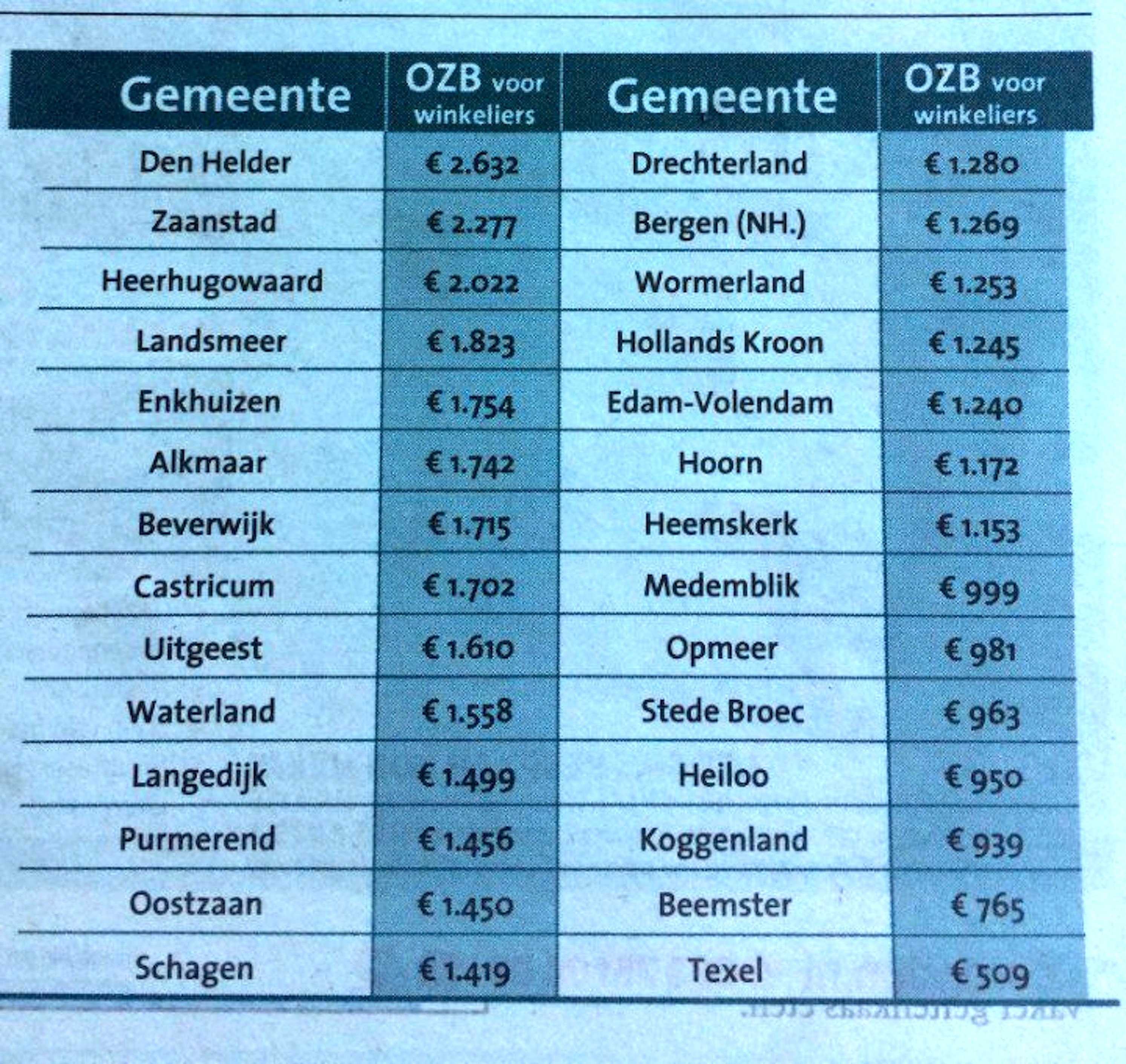 Nergens in Nederland betalen winkeliers minder OZB (onroerend zaakbelasting) dan op Texel. Detailhandelaren zijn daar gemiddeld € 509,- kwijt. Ter vergelijking: in de gemeente Den Helder betaalt een winkelier bijna vijf keer zoveel. Winkeliers ergeren zich groen en geel aan oplopende gemeentelijke lasten.